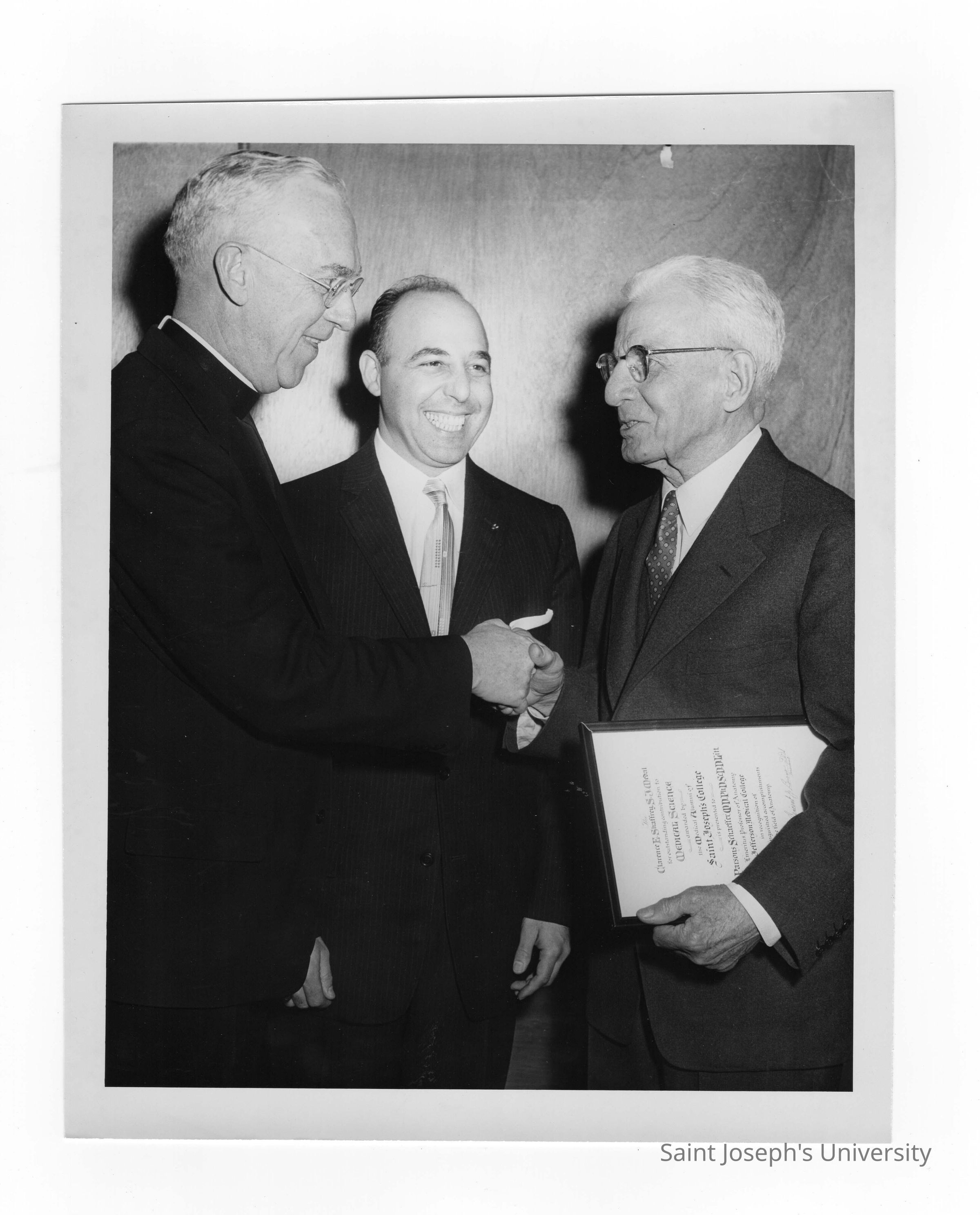J. Joseph Bluett, S.J., congratulating 1959 Shaffrey award winner, Dr. J. Parsons Schaeffer.