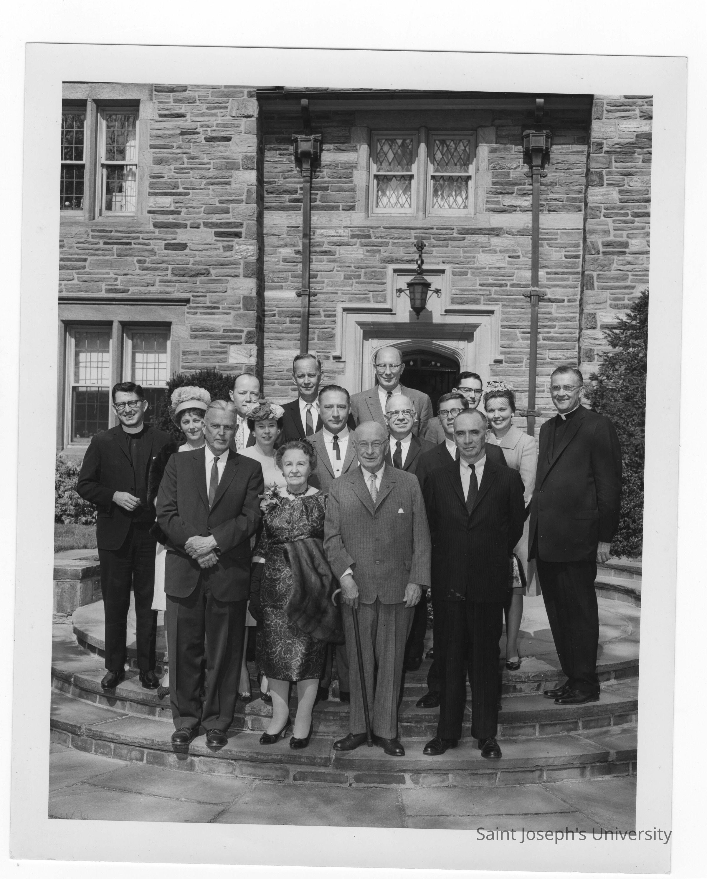 Dr. Truman G. Schnabel, Sr.,recipient of Shaffrey award, with family, guests, William F. Maloney, S.J., and others in front of Regis Hall, April 21, 1963