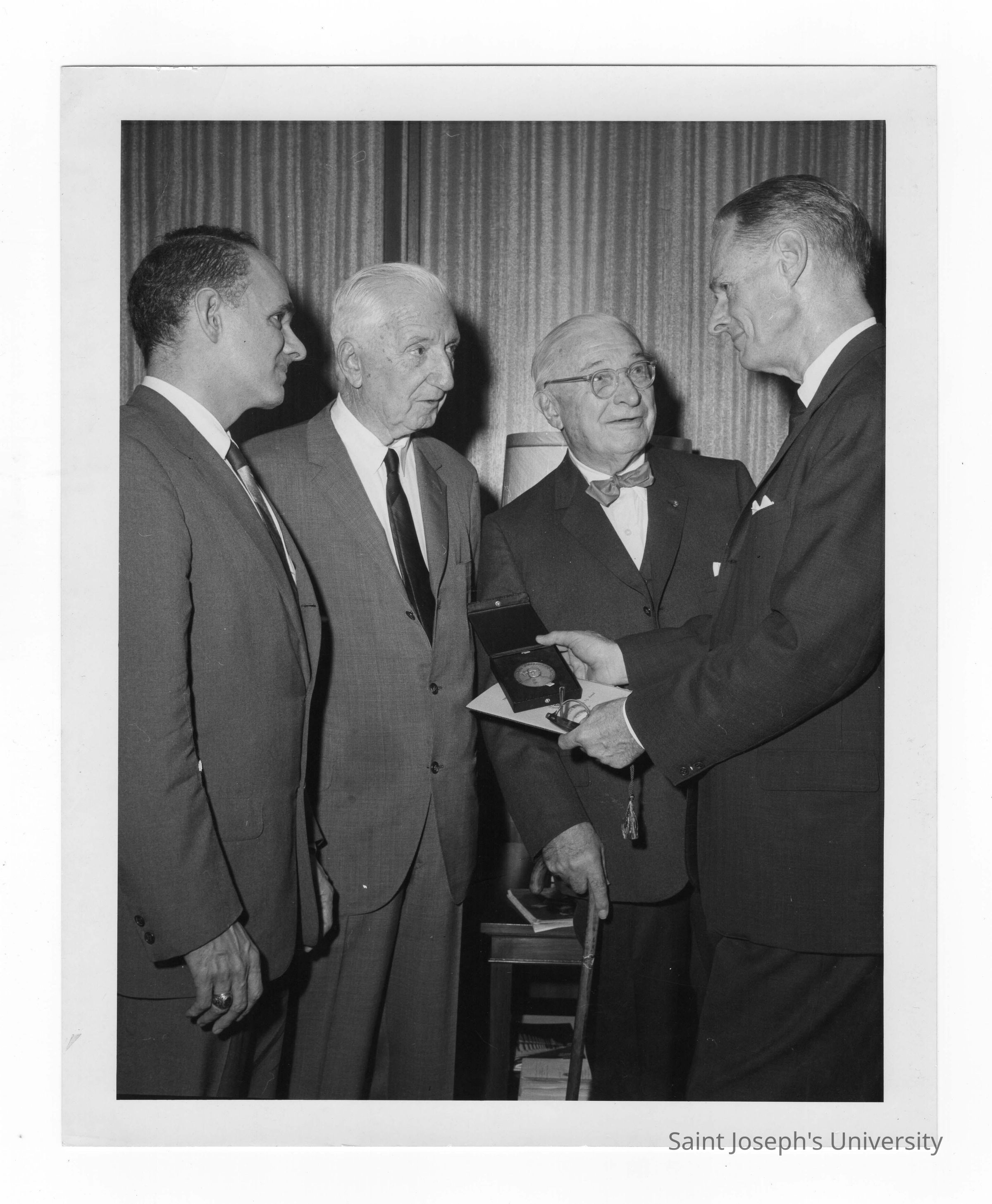 Shaffrey award recipient, Dr. Thomas M. Durant, showing medal and certificate to past award recipients, including Dr. Truman Schnabel, Dr. Alfred Bongiovanni, and Dr. William N. Parkinson, April 17,1966.