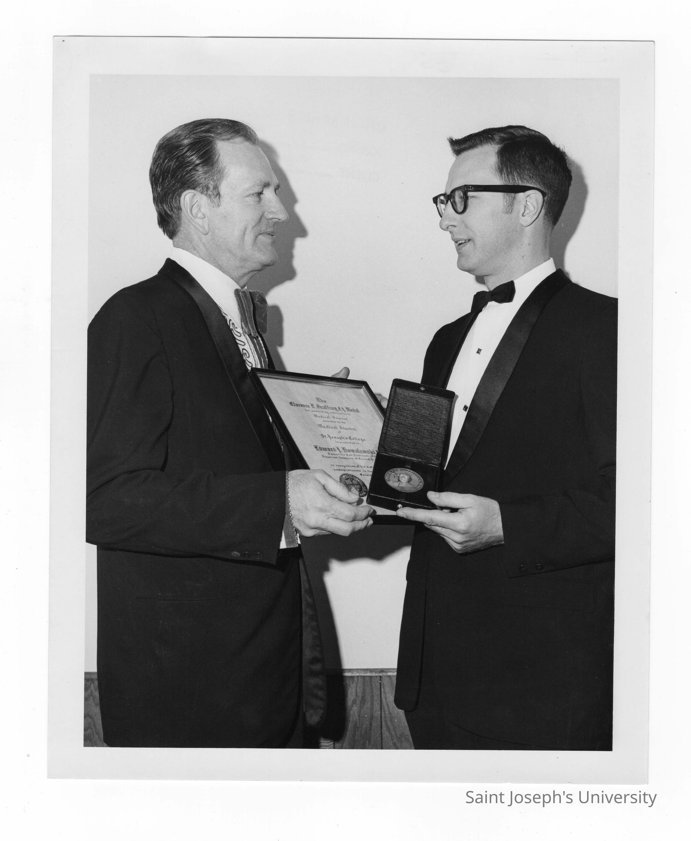Shaffrey award recipient, Dr. Edward J. Kowalewski, showing medal and certificate to another individual, March 27, 1971.