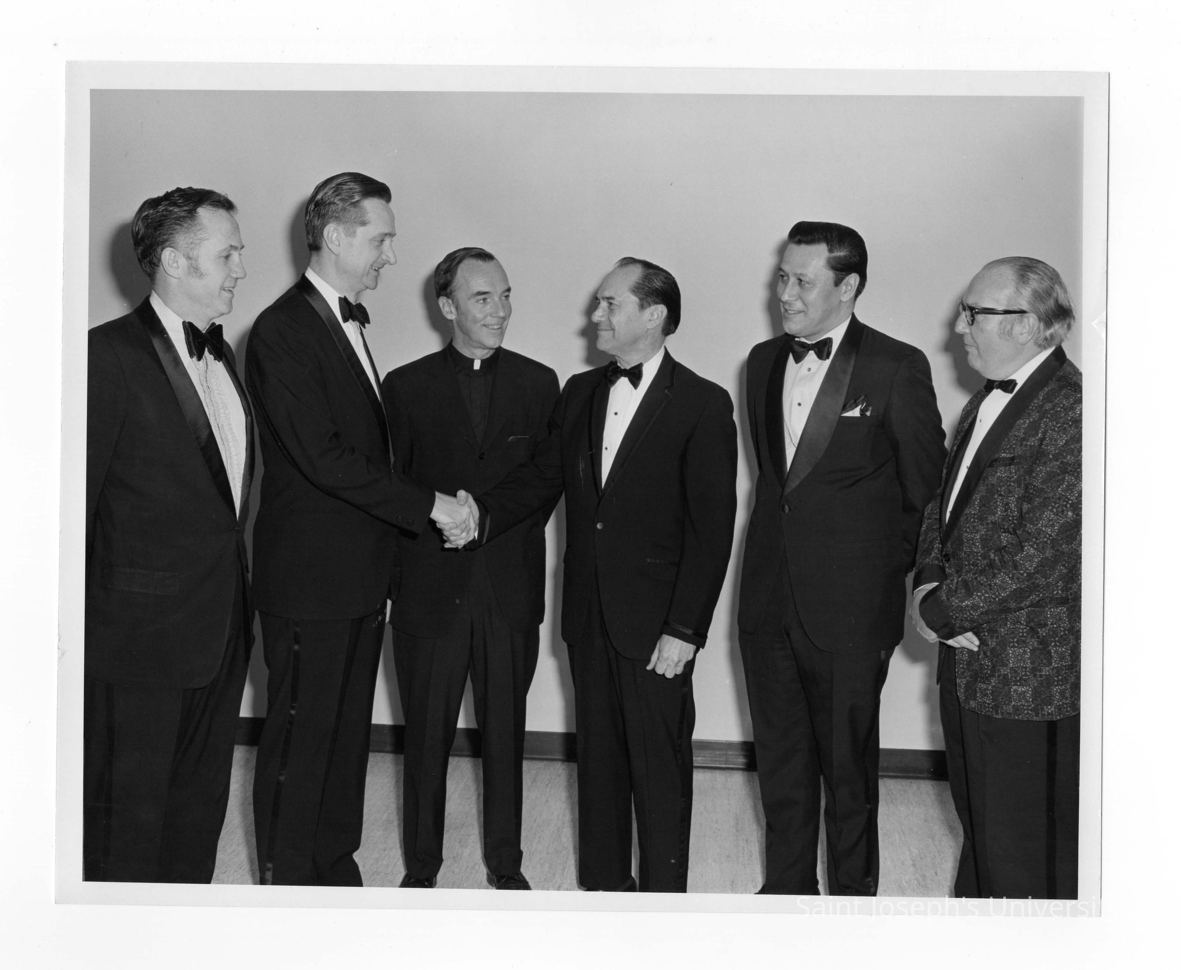 Terrence Toland, S.J., Louis Keeler, Joseph Donnelly, Ronald Bernardin, Raymond Jason, and Edward Kelly before Shaffrey award dinner, April 22, 1972. Recipient, Dr. Max Levin not pictured in photograph.