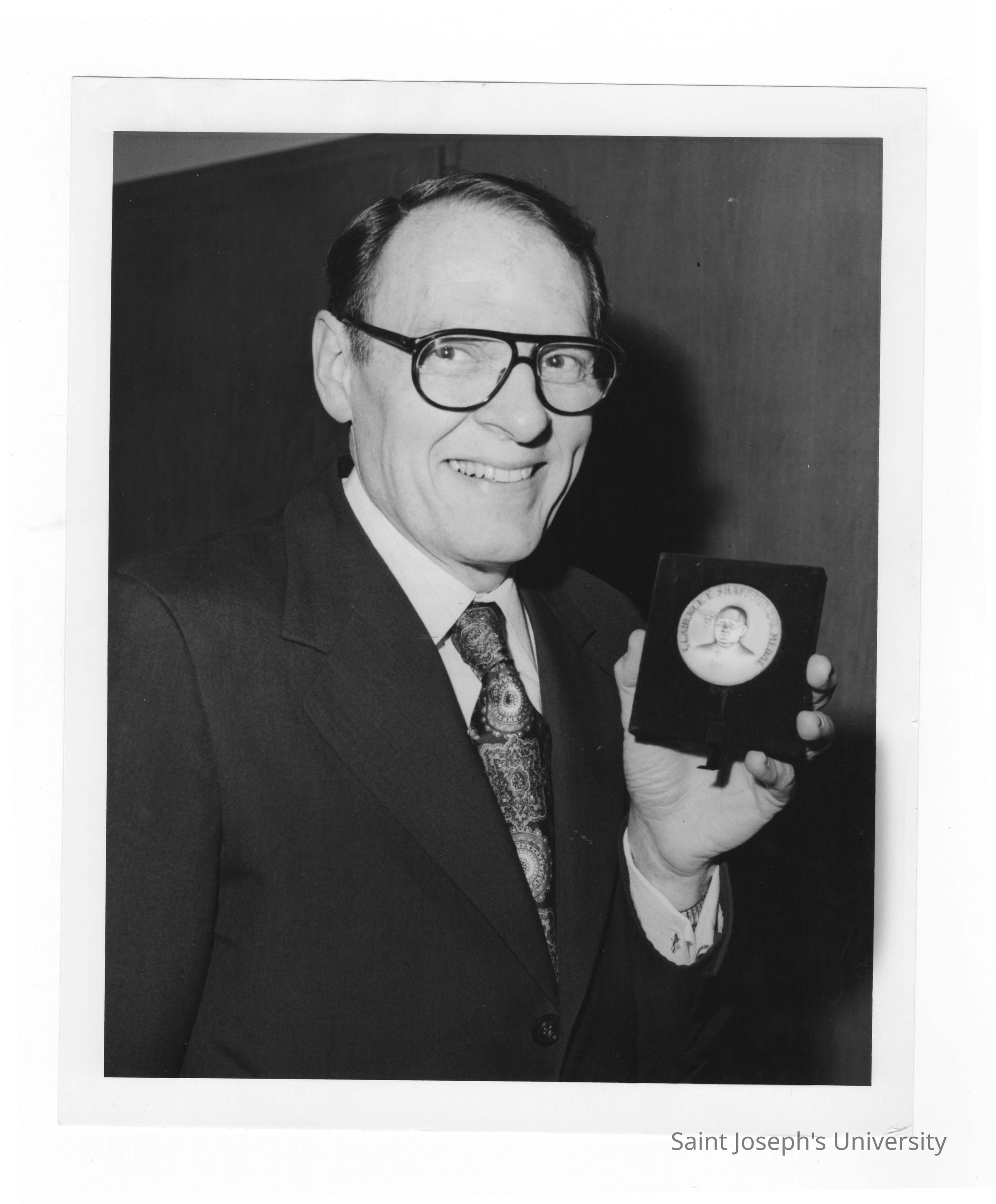 Shaffrey award recipient, Dr. William F. Kellow, holding medal, April 23, 1978.