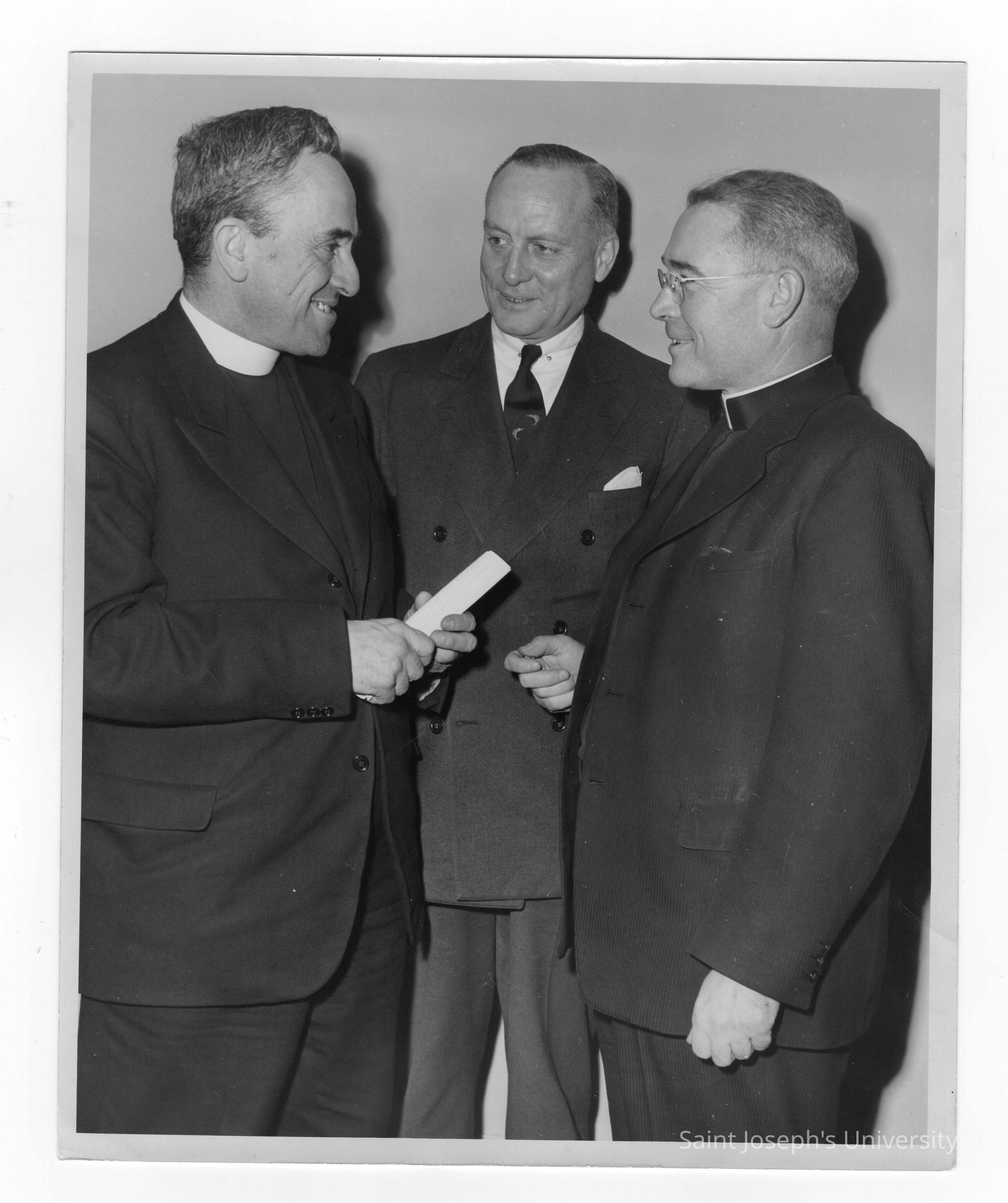 John J. Long, S.J., with John Horstmann and Bernard Hubbard, S.J., who visited SJC campus on January 16, 1948 for lecture forum.