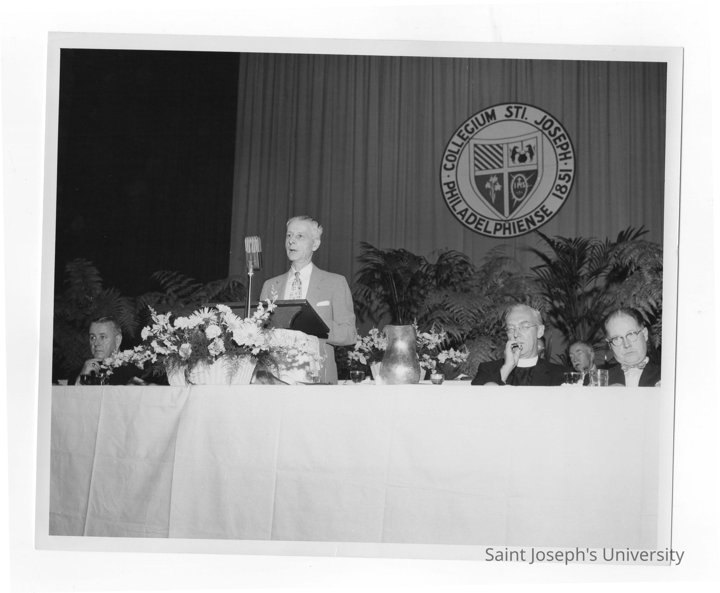 Testimonial Dinner for Joseph S. Hogan, S.J. for 75th Birthday and 35th Anniversary with J. Joseph Bluett, S.J., Bishop Joseph McShea, and Daniel J. Dougherty, May 26, 1957.