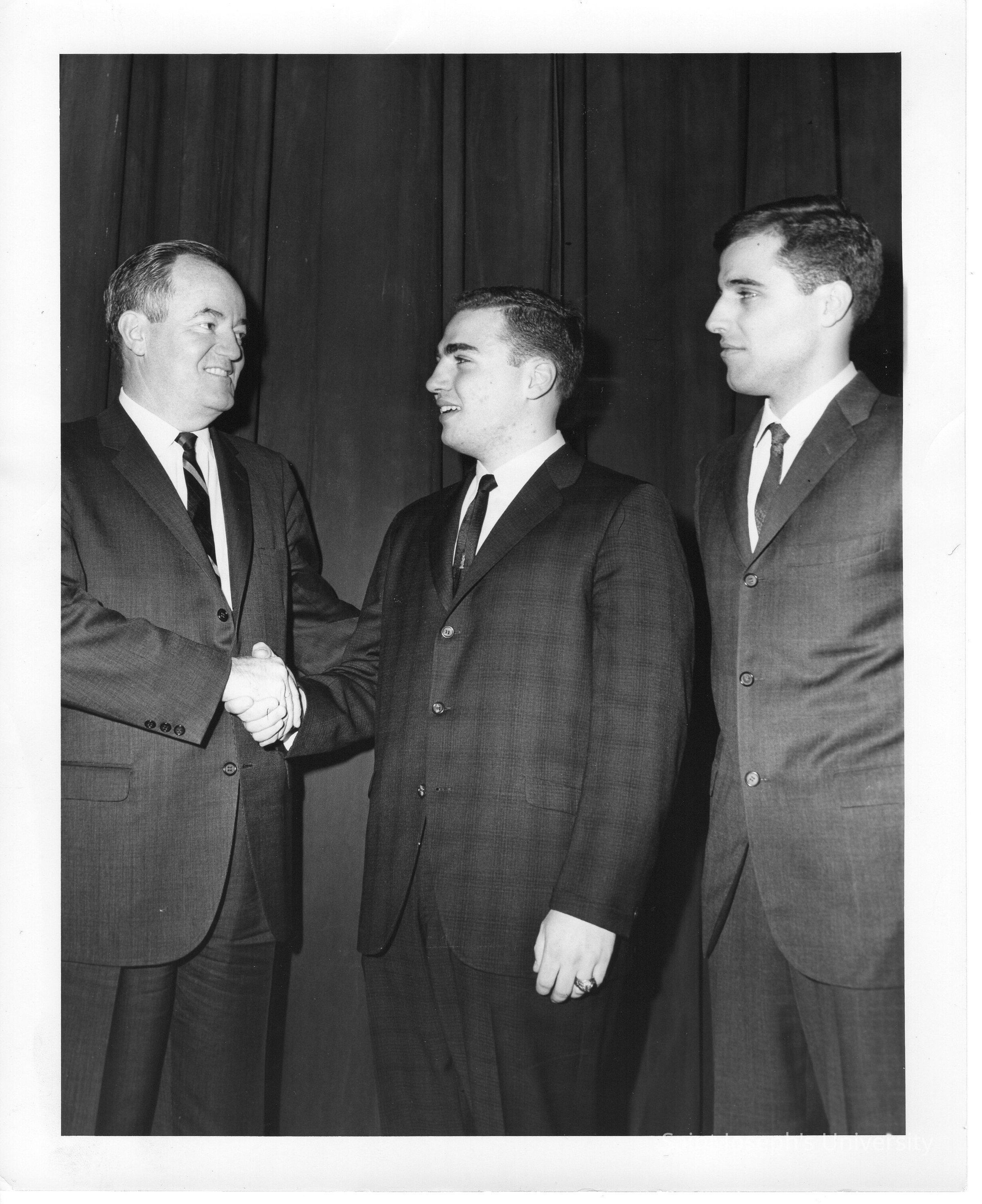 Senator Hubert Humphrey with two students during visit to SJC campus for speech, April 15, 1962.