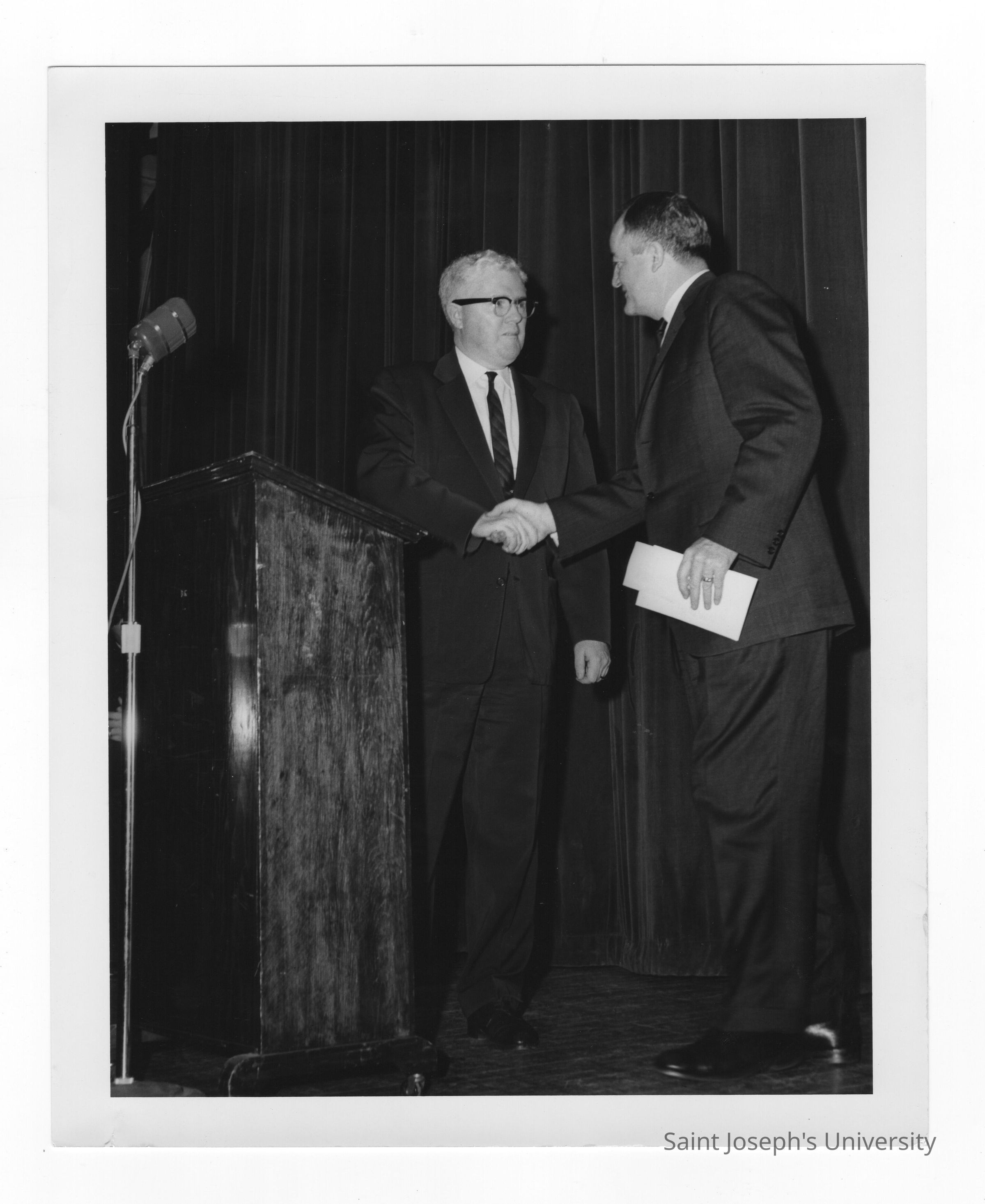 Dr. James Dougherty welcoming Senator Hubert Humphrey during visits to campus to deliver speech.