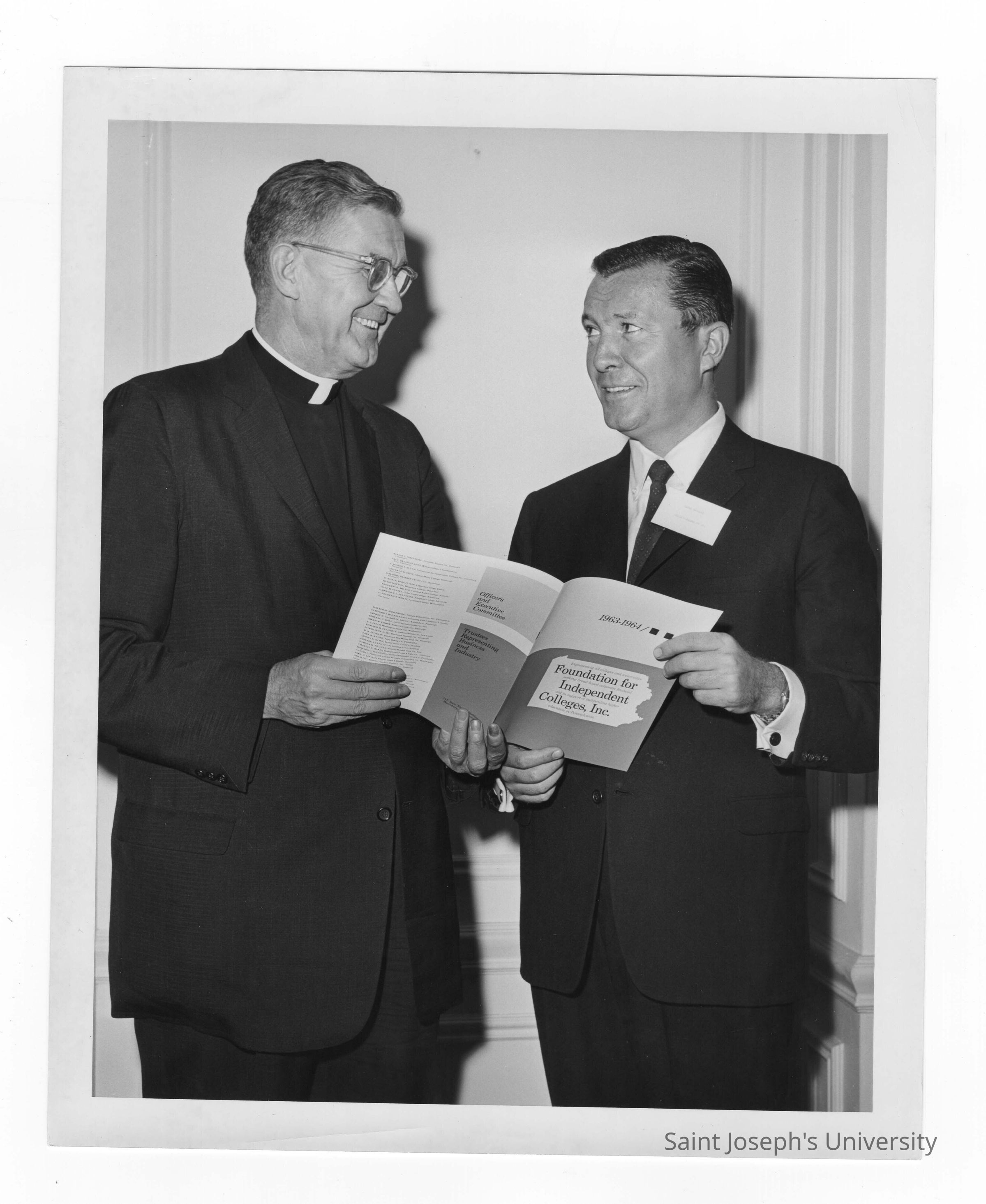 William F. Maloney, S.J., and David Mahoney looking at brochure during Business Ethics Workshop conducted at SJC on November 8 - 9, 1963.