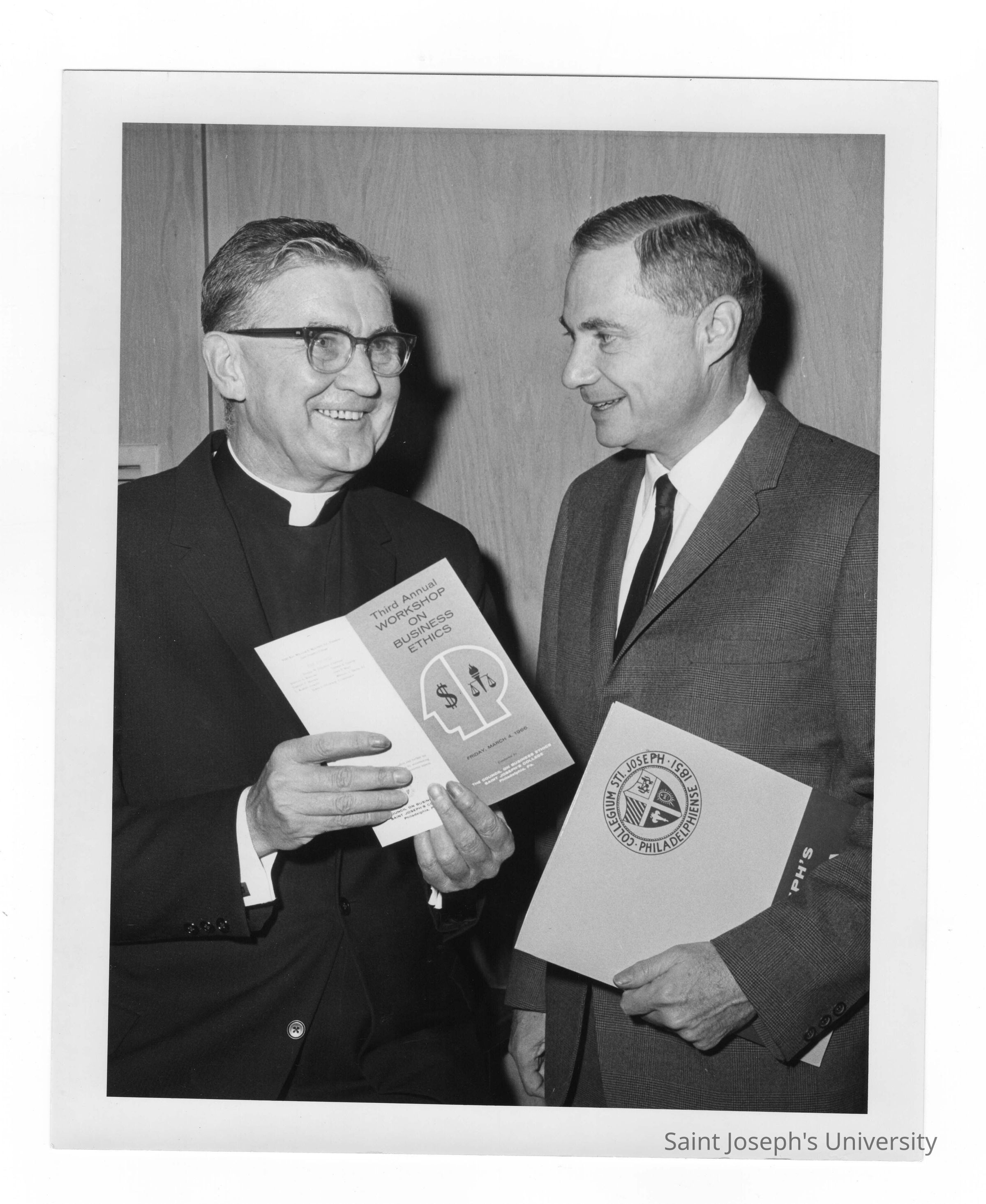 William F. Maloney, S.J. and Milton Shapp looking at brochure for third annual Workshop on Business Ethics, March 4, 1966.