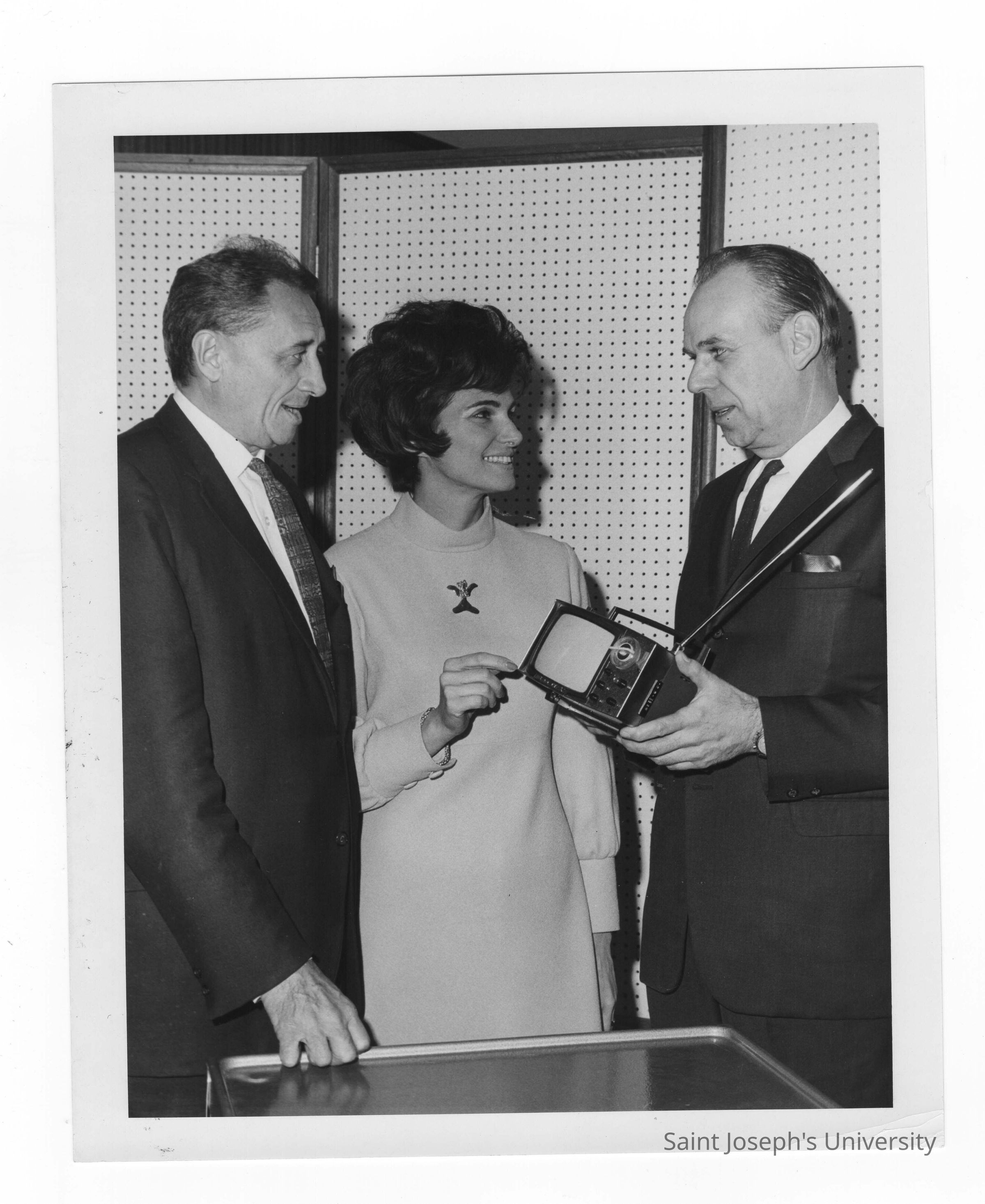 Rex Polier, Marcia Rose and John Roberts at SJC Workshop on Business Ethics, December 9, 1968. The workshop title was The Power of the Tube, discussing the impact of television.