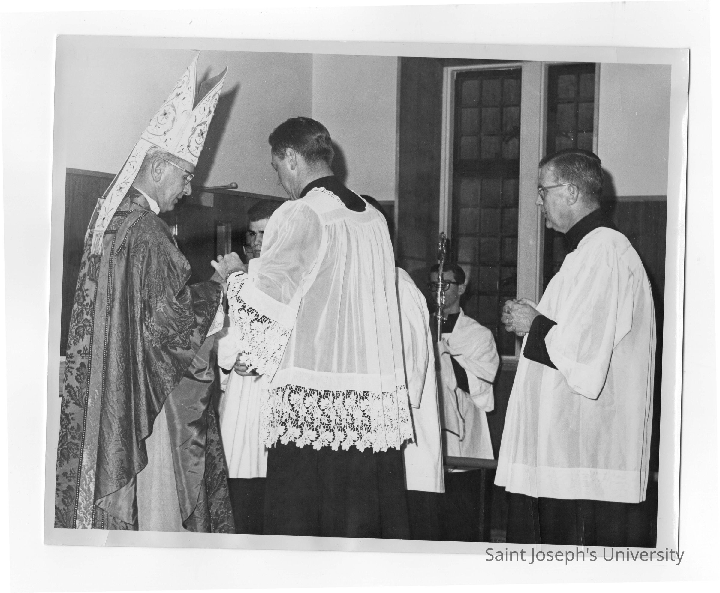Archbishop John Krol, William F. Maloney, S.J, and others at Mass during Saint Joseph's week, March 1964.