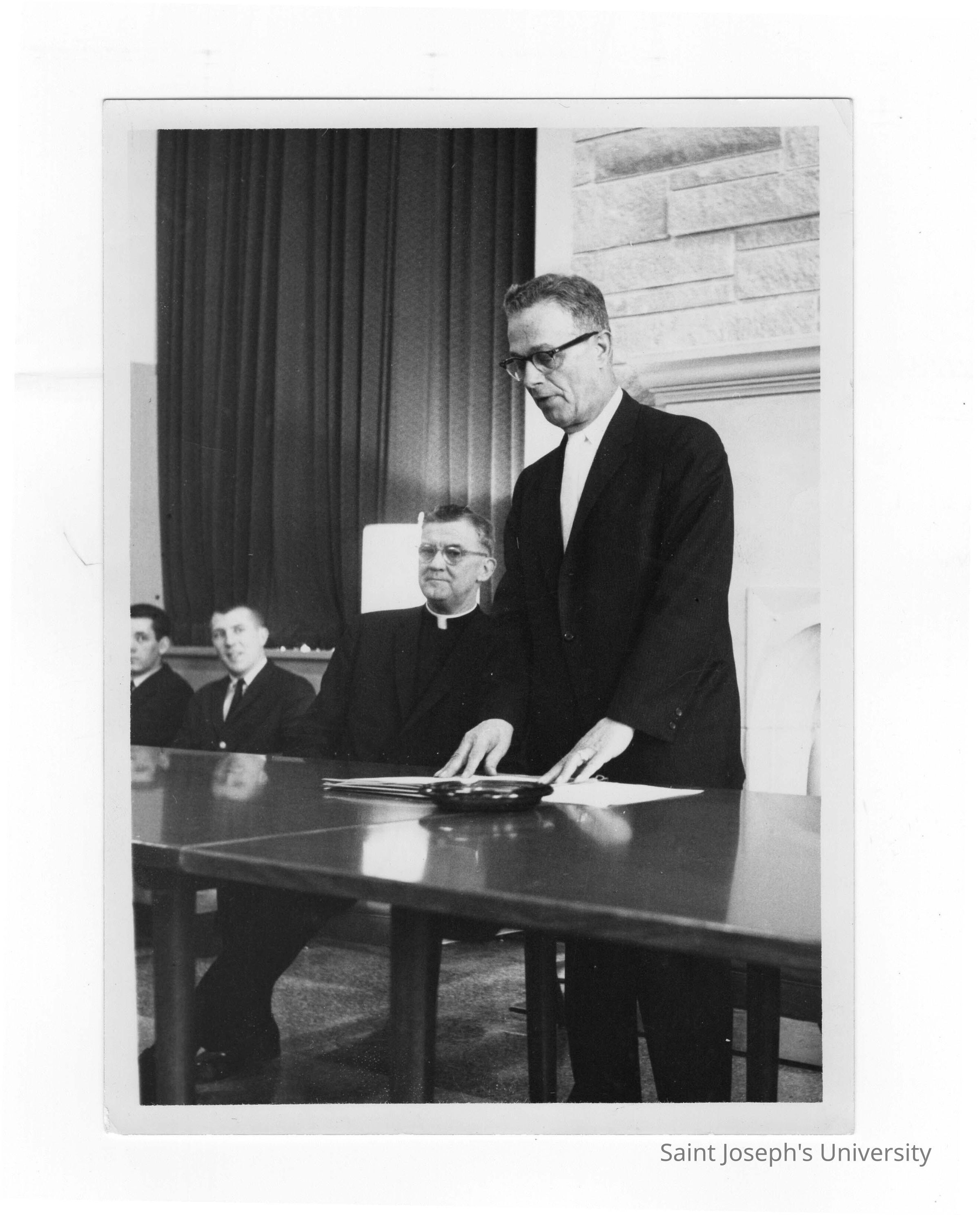 Paul D'Ortona, President of Philadelphia City Council addresses gathering in Campion Hall, c. 1965, with William F. Maloney, S.J., and students in backgrounds.