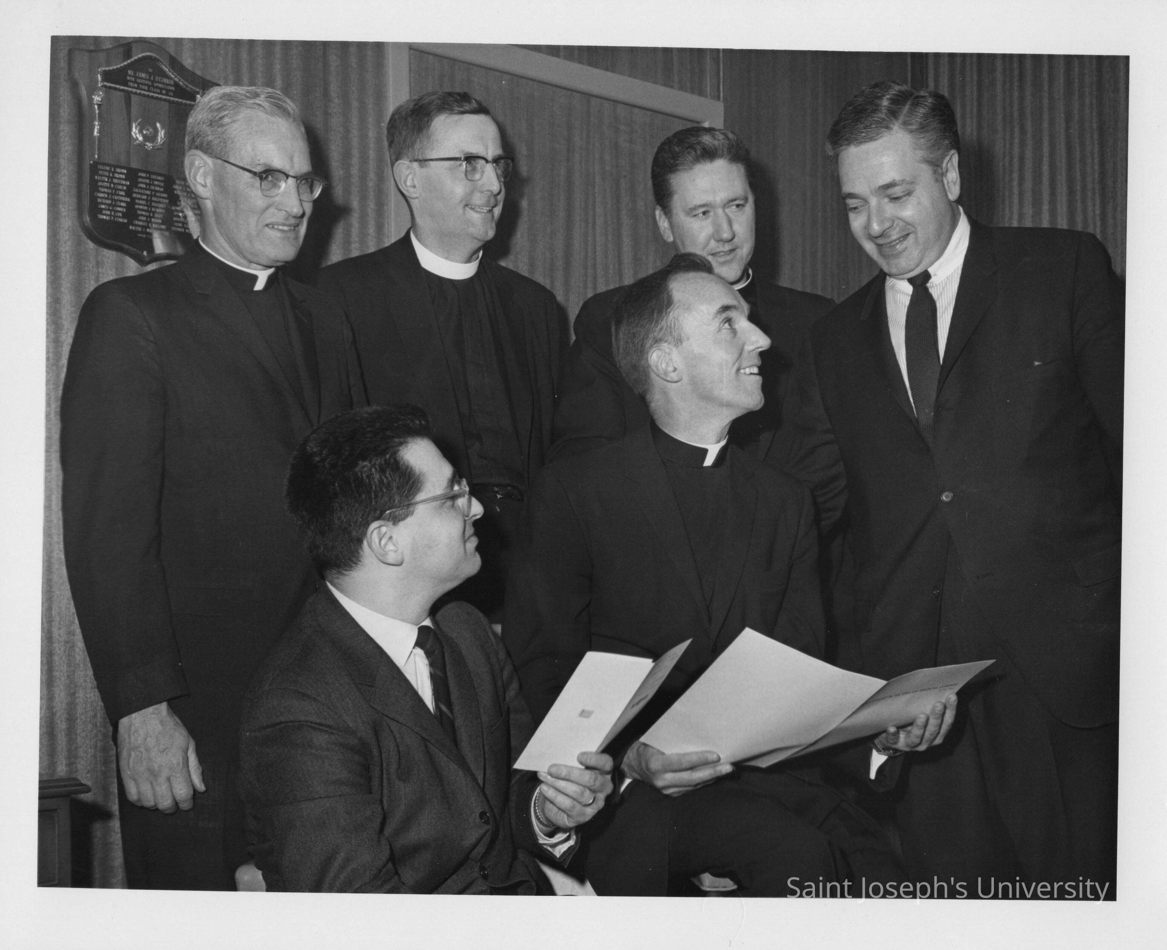 Photo of some individuals attending First Annual Institute on Catholic-Jewish relations, including Terrence Toland, S.J., Michael Smith, S.J., Rev. Geroge G. Higgins, and others, March 5-6, 1967.