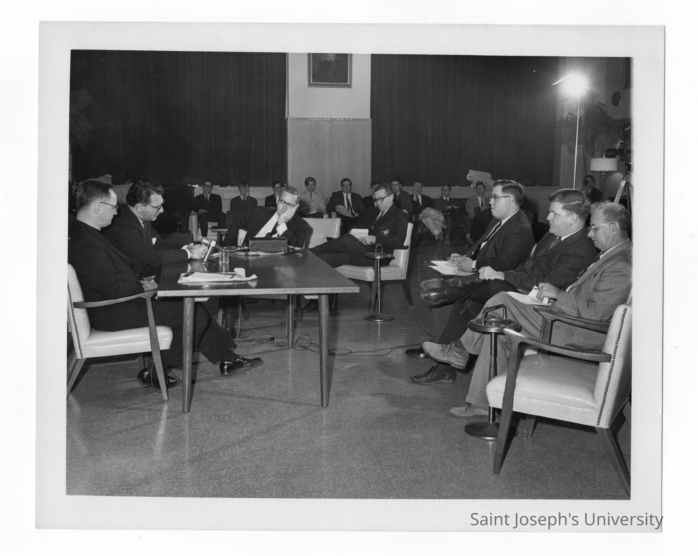 View of individuals listening to Msgr. George Higgins, Rabbi Marc Tanenbaum First Annual Institute on Catholic-Jewish relations, March 5-6, 1967 in Campion Hall.