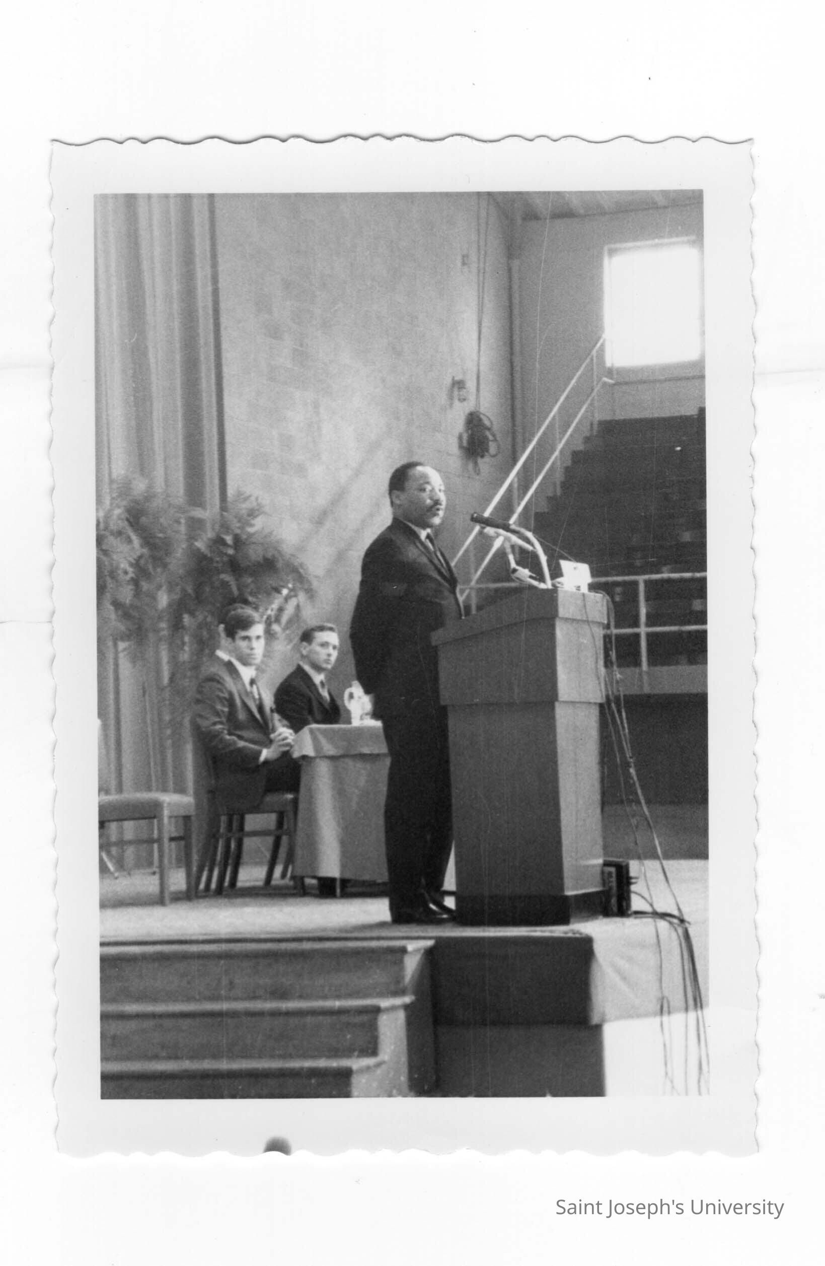 Dr. Martin Luther King, Jr. delivering speech at Saint Joseph's College, October 26, 1967 in Field House.