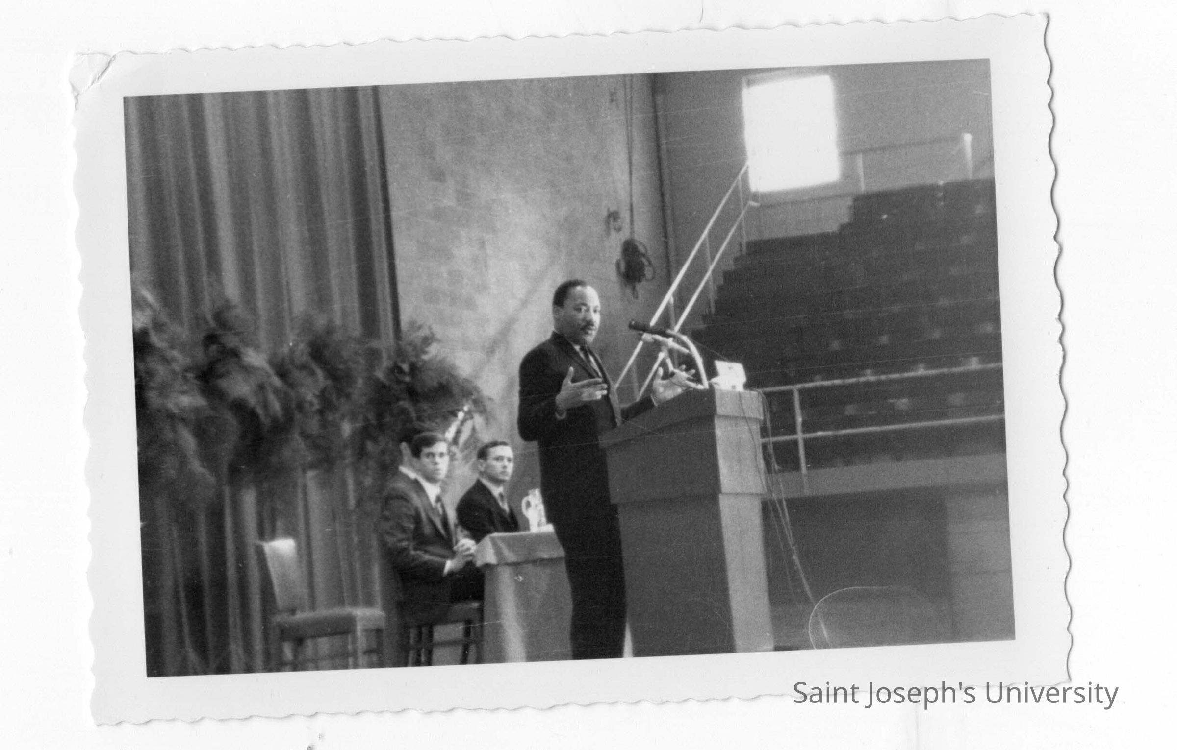 Dr. Martin Luther King, Jr. delivering speech at Saint Joseph's College, October 26, 1967 in Field House.