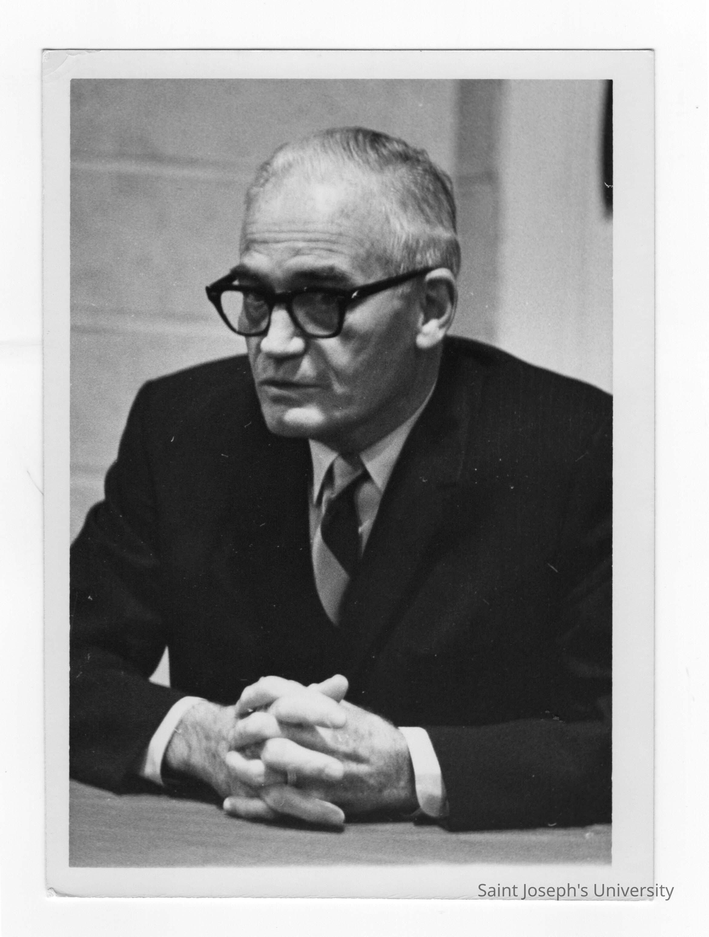 Senator Barry Goldwater being interviewed during his visit to Saint Joseph's College to deliver speech, February 8, 1968.