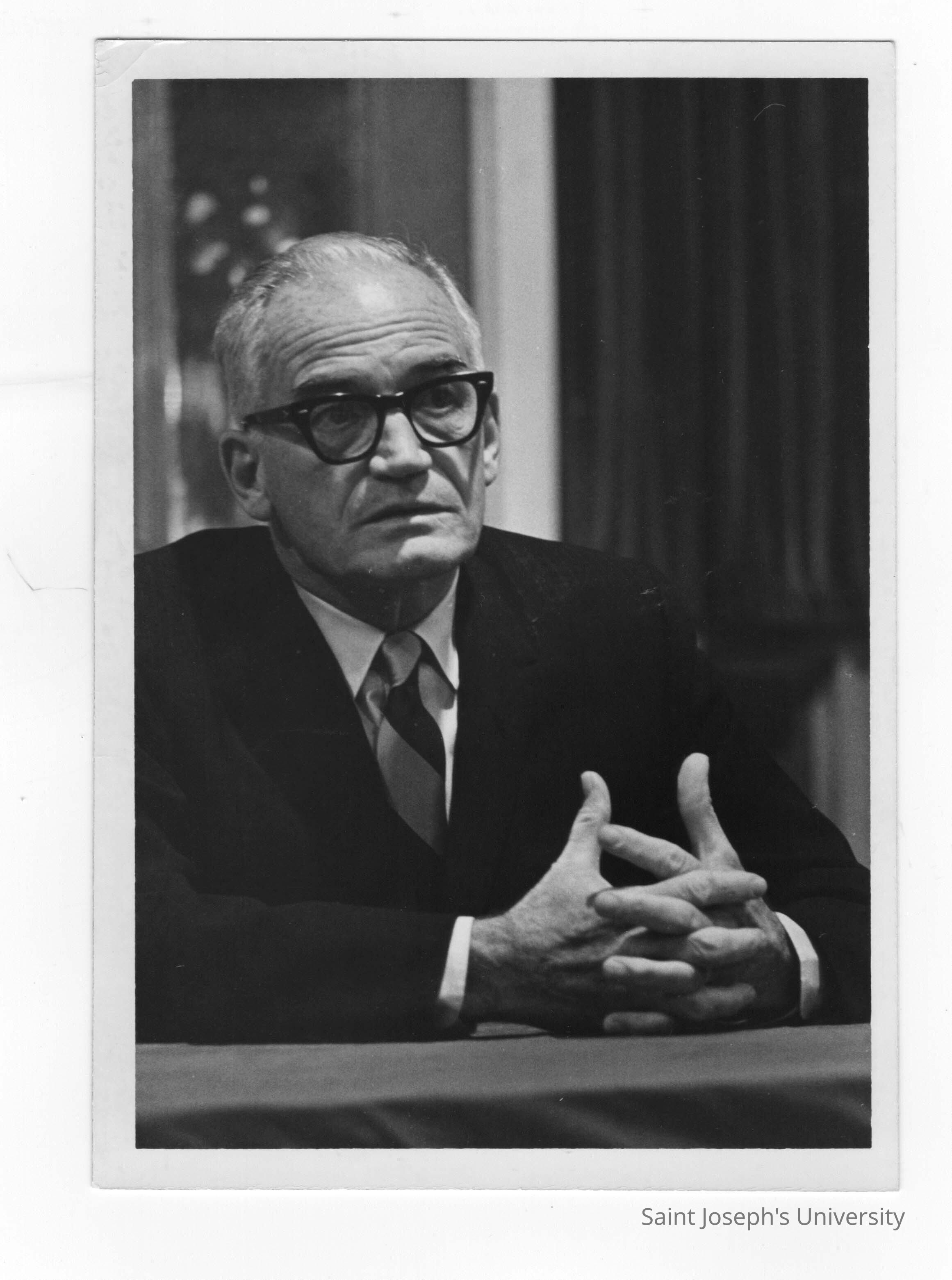 Senator Barry Goldwater being interviewed during his visit to Saint Joseph's College to deliver speech, February 8, 1968.