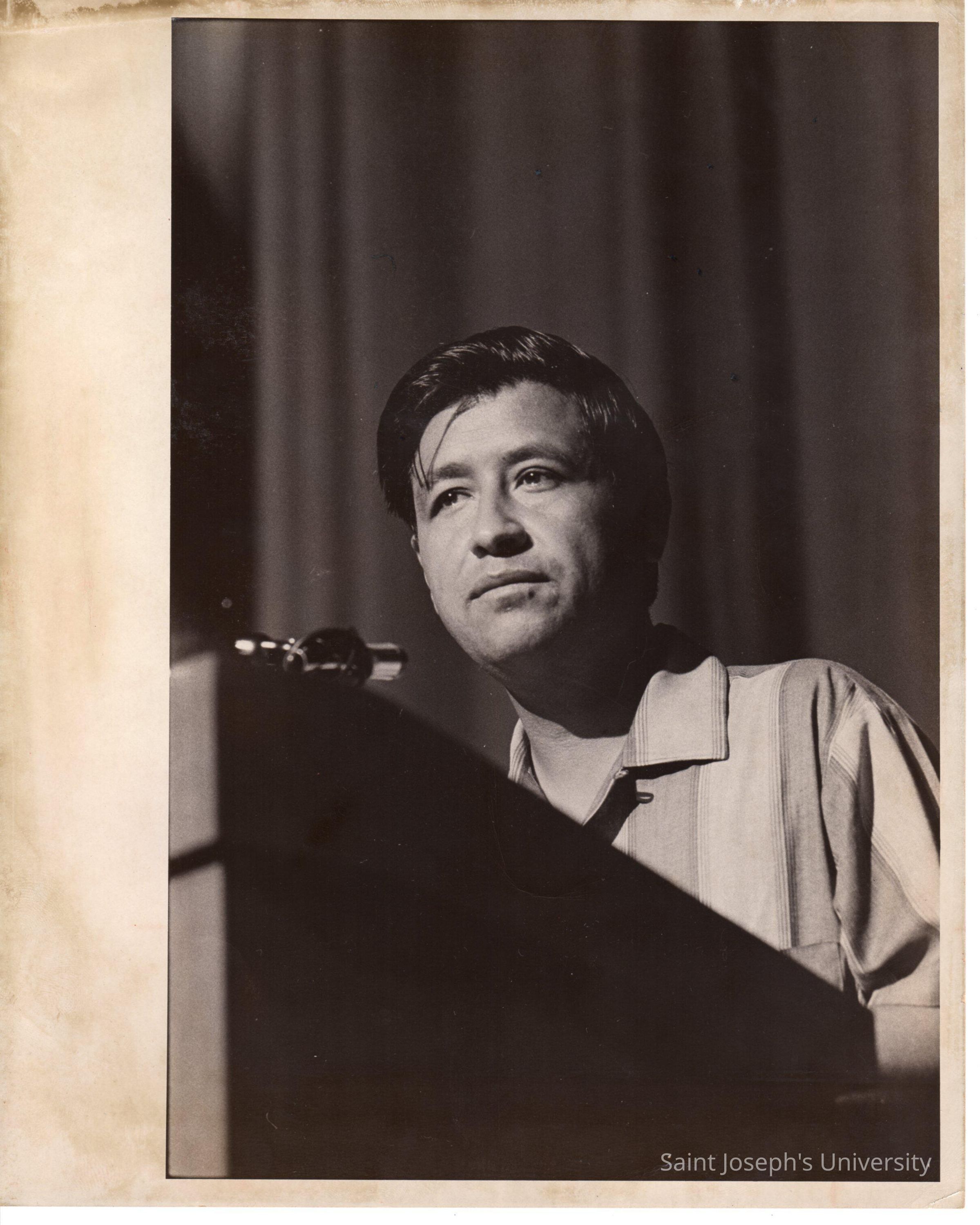 Cesar Chavez addressing audience during Pax Romana's 20th World Plenary Assembly at Saint Joseph's College, August 1968.