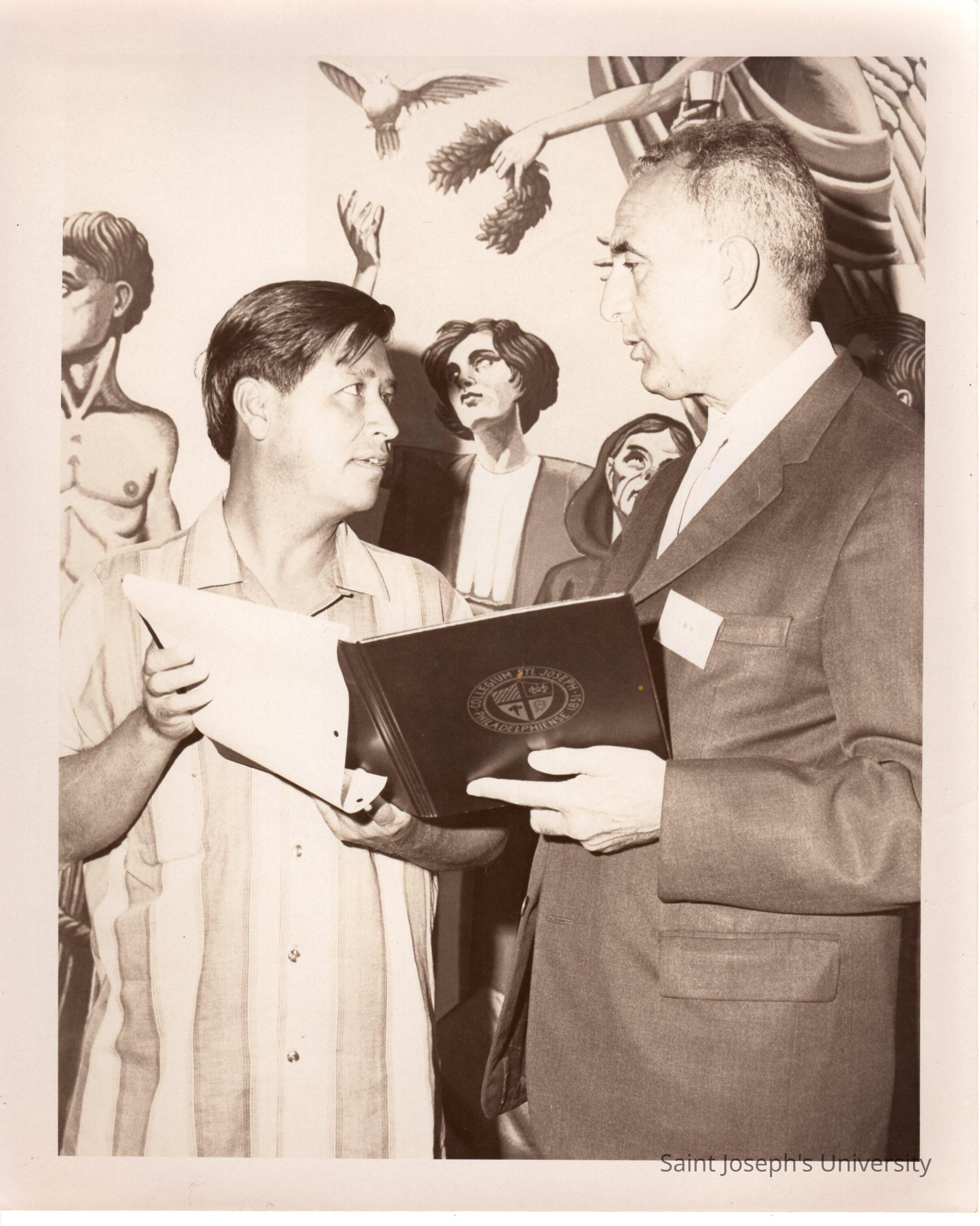 Pax Romana's 20th World Plenary Assembly meets at Saint Joseph's College. Cesar Chavez converses with Dr. Joaquin Ruiz-Gimenez, President of Pax Romana in Academy of Food Marketing Library.