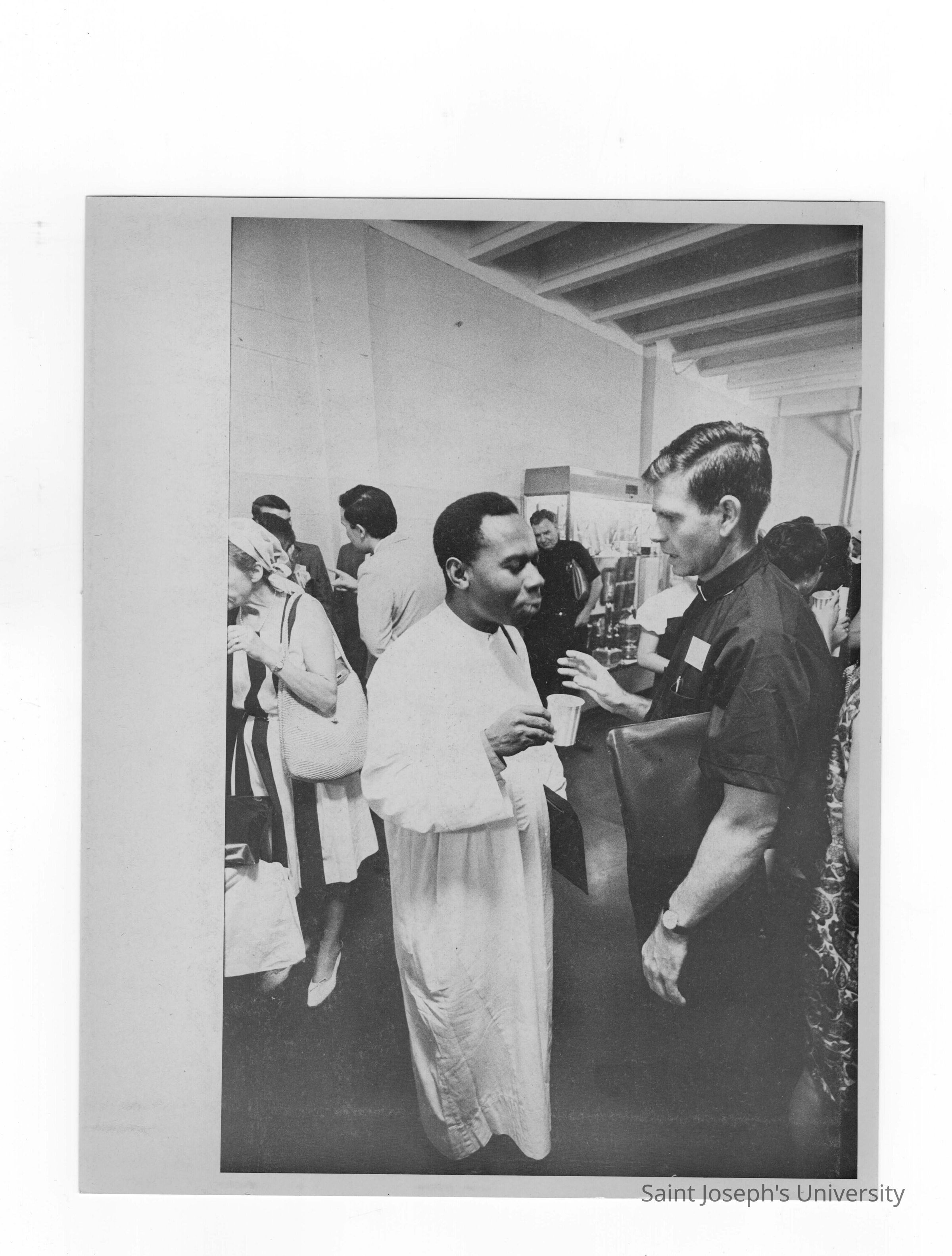 Pax Romana's 20th World Plenary Assembly meets at Saint Joseph's College, August 1968. View of attendees taking a break in the Field House lobby.