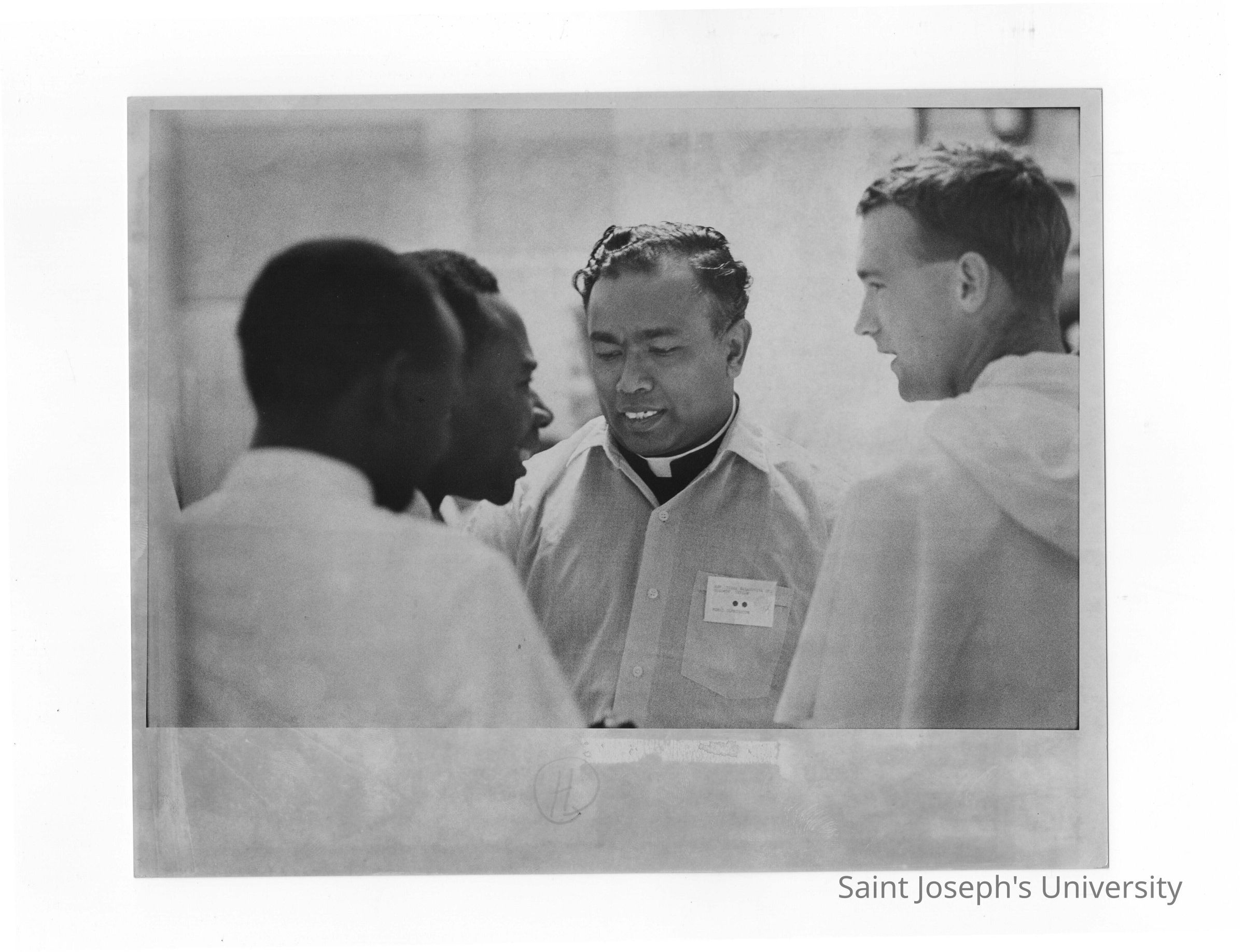 Pax Romana's 20th World Plenary Assembly meets at Saint Joseph's College, August 1968. View of attendees taking a break in the Field House lobby.
