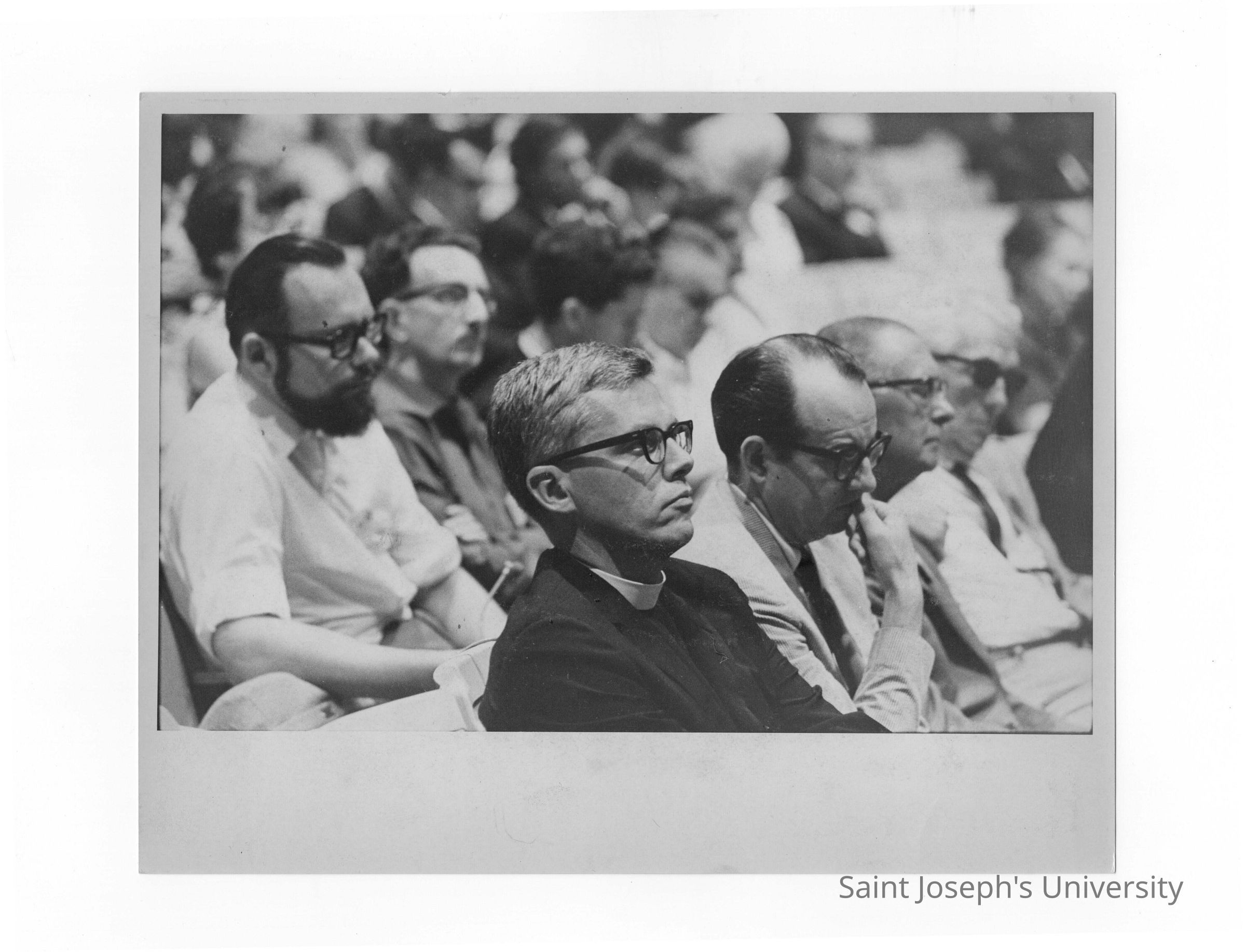 Pax Romana's 20th World Plenary Assembly meets at Saint Joseph's College, August 1968. View of audience, including Jerome Coll, S.J. and Thomas Melady, listening to Lecture.Entry/Object ID