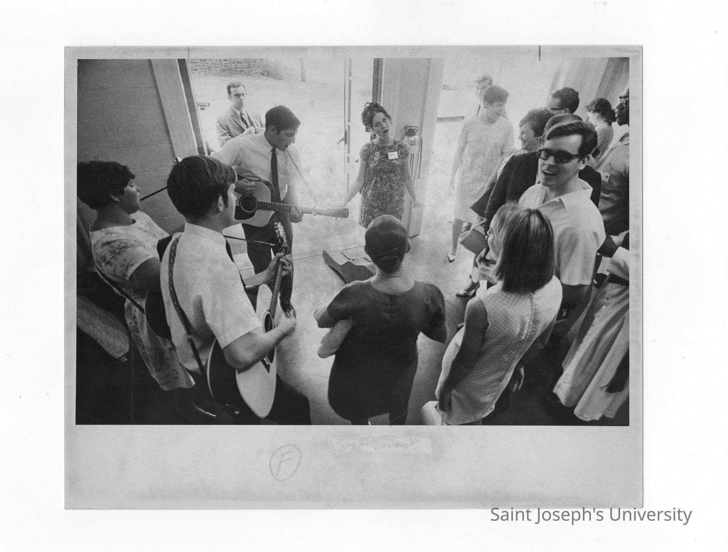 Pax Romana's 20th World Plenary Assembly meets at Saint Joseph's College, August 1968. Group of guitarists and singers practice before liturgy.