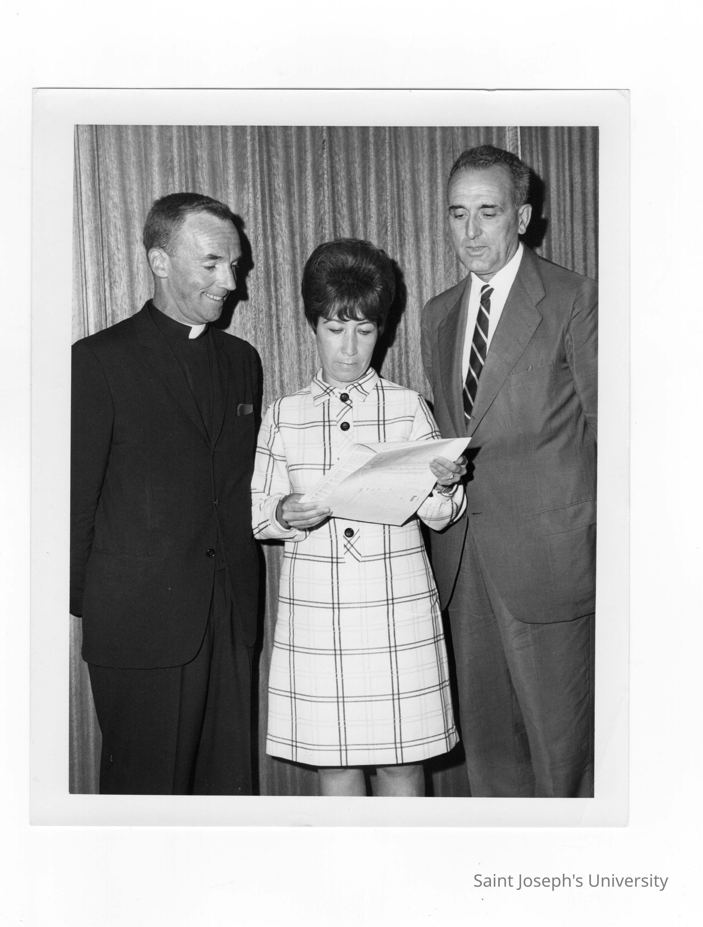 Pax Romana's 20th World Plenary Assembly meets at Saint Joseph's College, August 1968. Terrence Toland, S.J., and Joaquin Ruiz-Gimenez meet with Mrs. Maria Cruz, acting President of OPEN, about public housing needs.