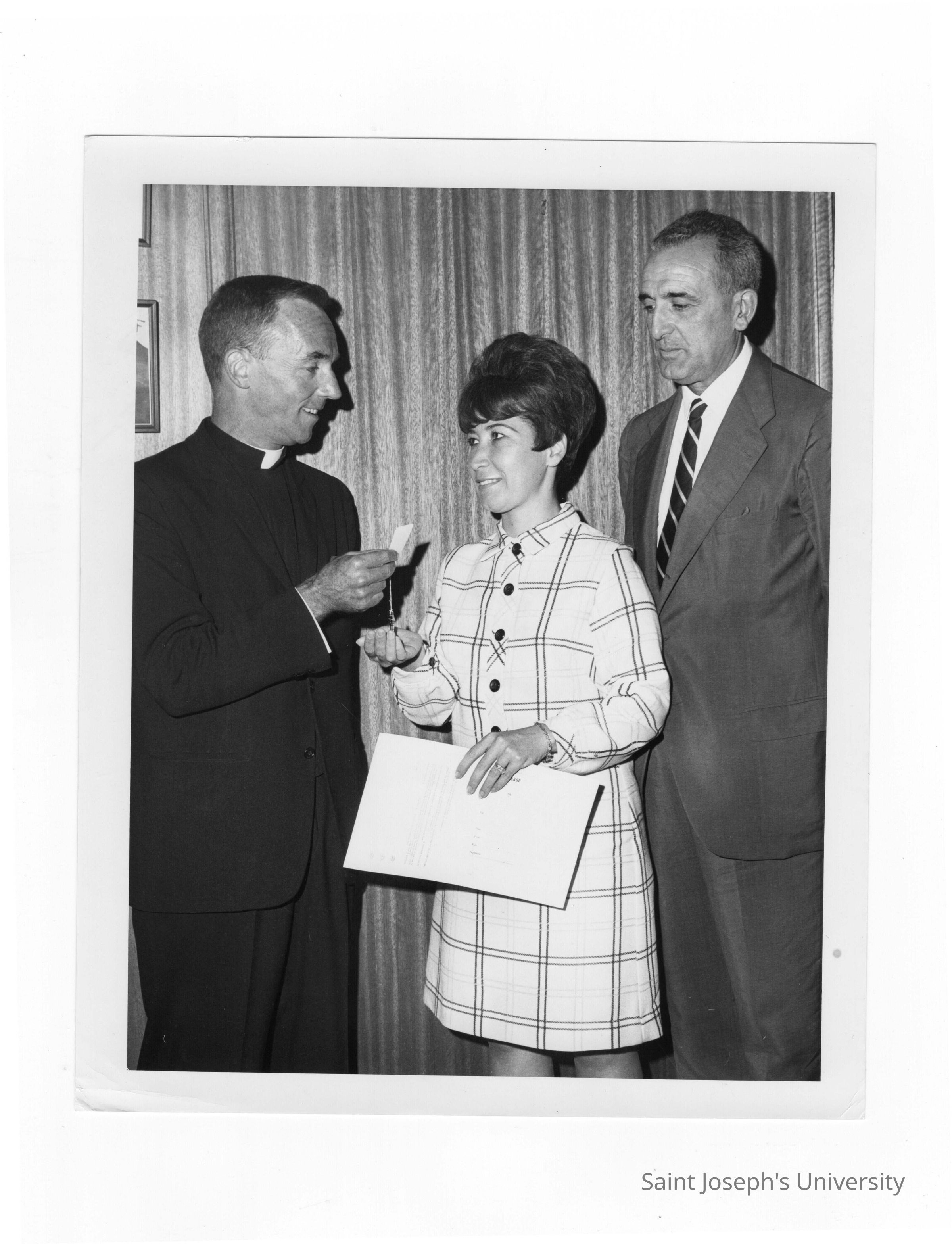 Pax Romana's 20th World Plenary Assembly meets at Saint Joseph's College, August, 1968. Terrence Toland, S.J. presents key to ghetto building to Mrs. Maria Cruz, Acting President of OPEN, while Dr. Joaquin Ruiz-Gimenez, President of Pax Romana, looks on.Entry/Object ID