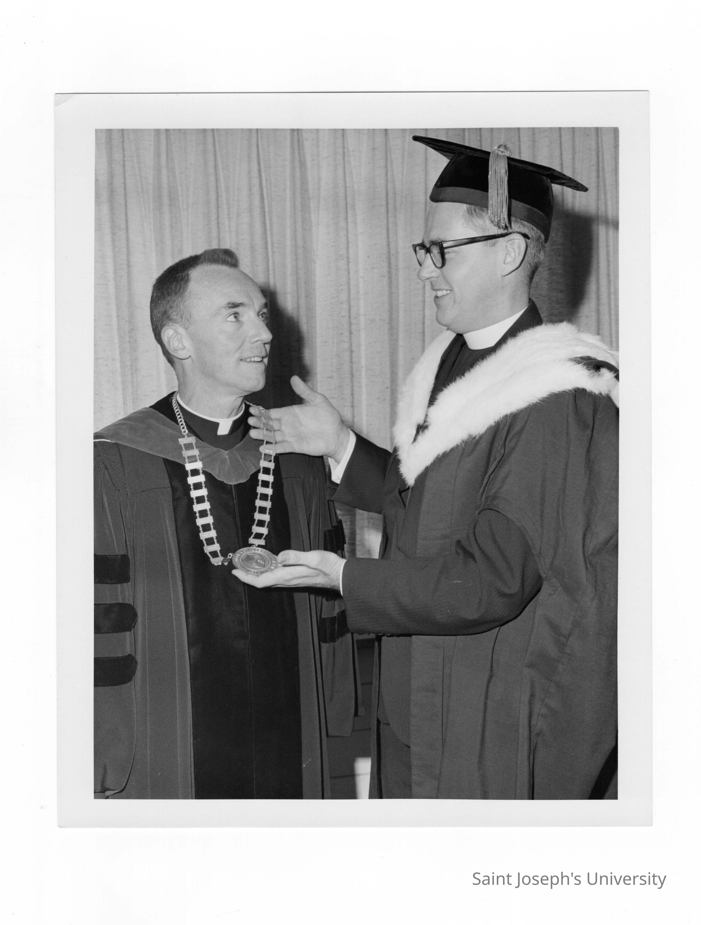 Inauguration of President Terrence Toland, S.J., November 14, 1968. Before ceremony, Toland and Jerome Coll, S.J. try out Chain of Office in a picture-taking session.