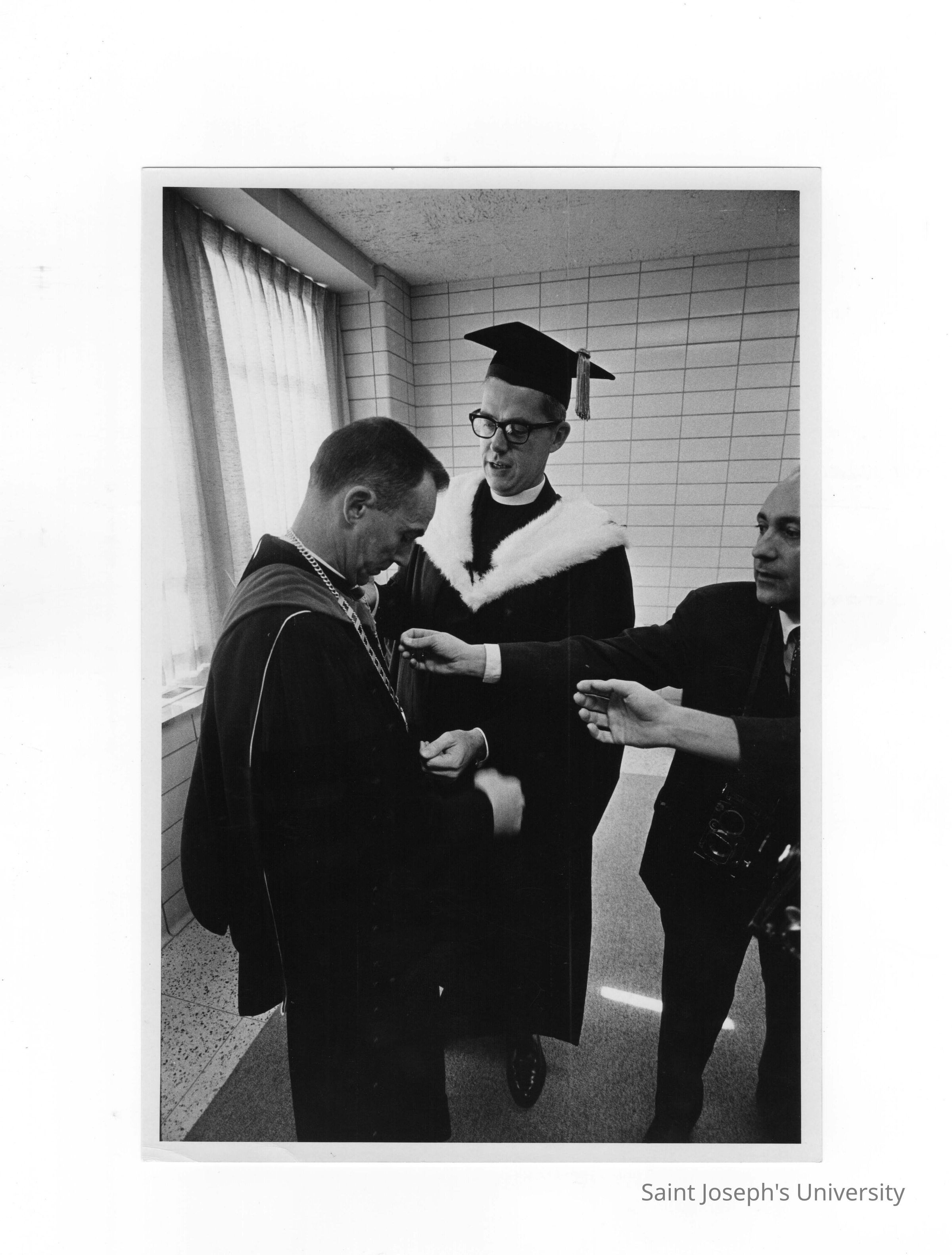 Inauguration of President Terrence Toland, S.J., November 14, 1968. Before ceremony, Toland and Jerome Coll, S.J. practice the investiture for picture-taking session.
