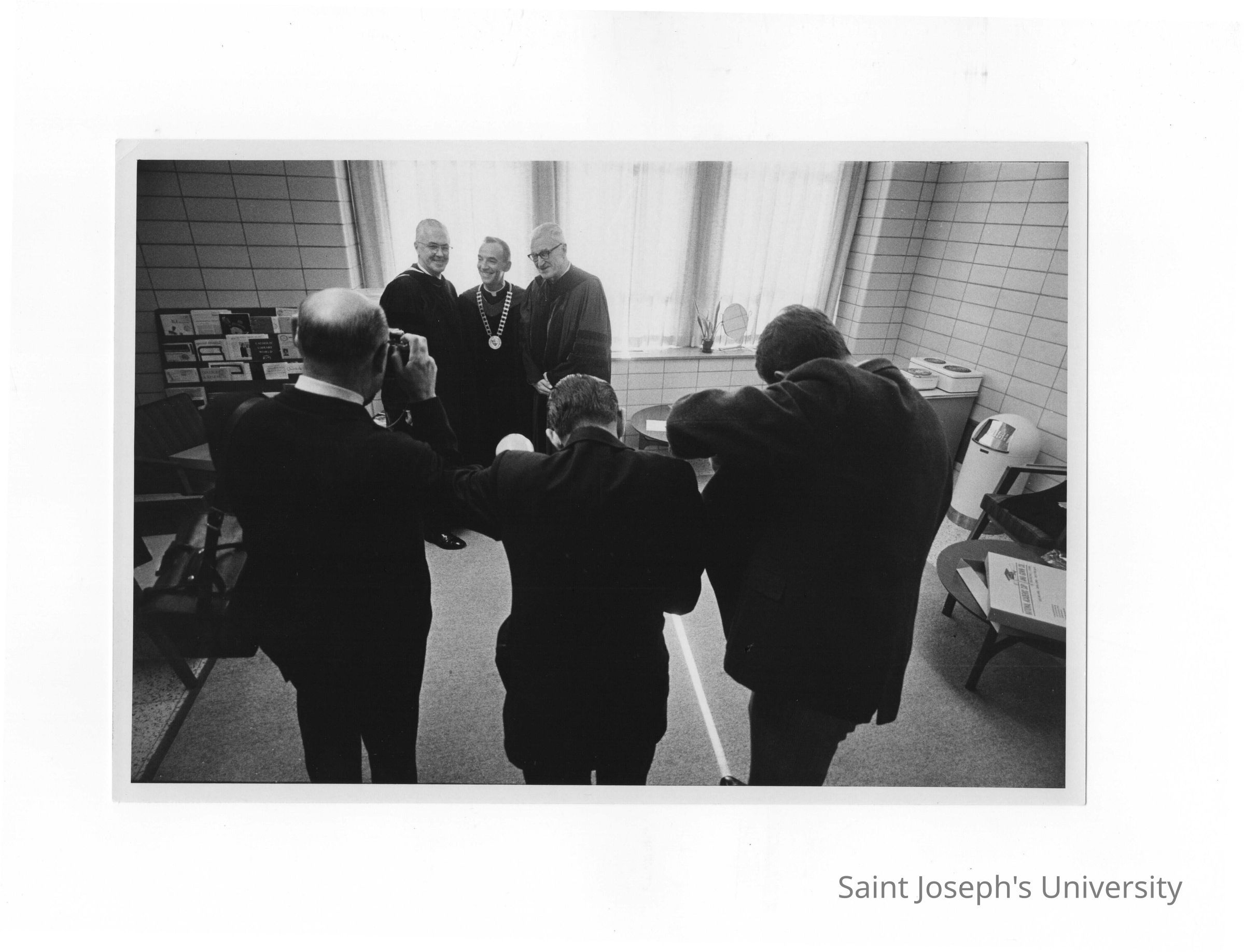 Inauguration of President Terrence Toland, S.J., November 14, 1968. Before ceremony, Toland poses with James H.J. Tate and Gaylord P. Harnwell during picture-taking session.