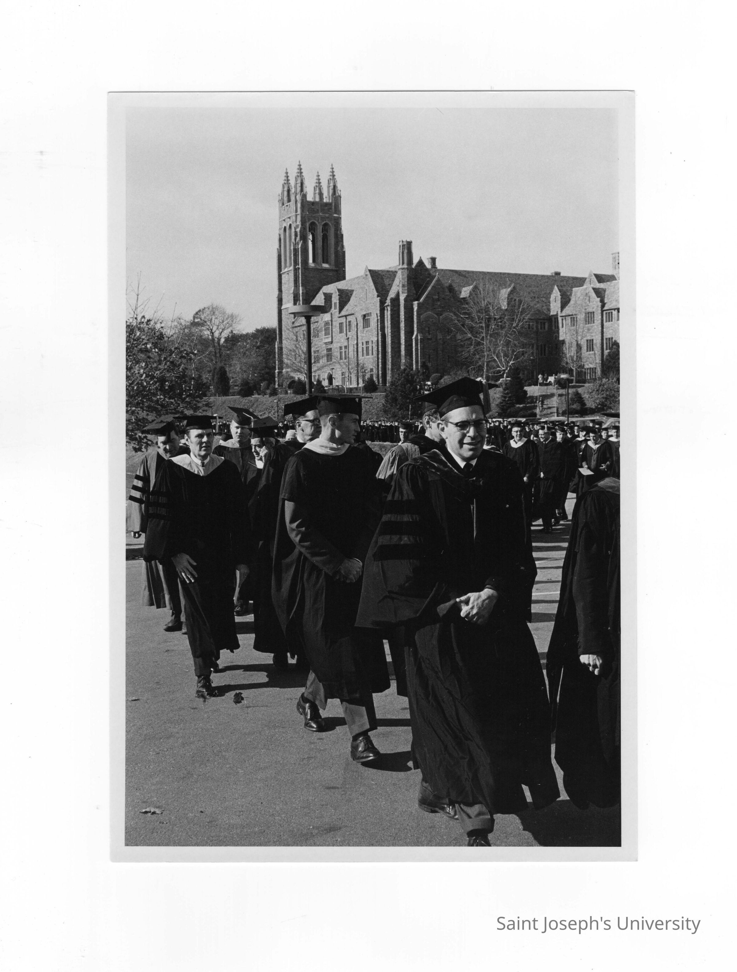Inauguration of President Terrence Toland, S.J., November 14, 1968. View of academic procession on way from Drexel Library to Field House.
