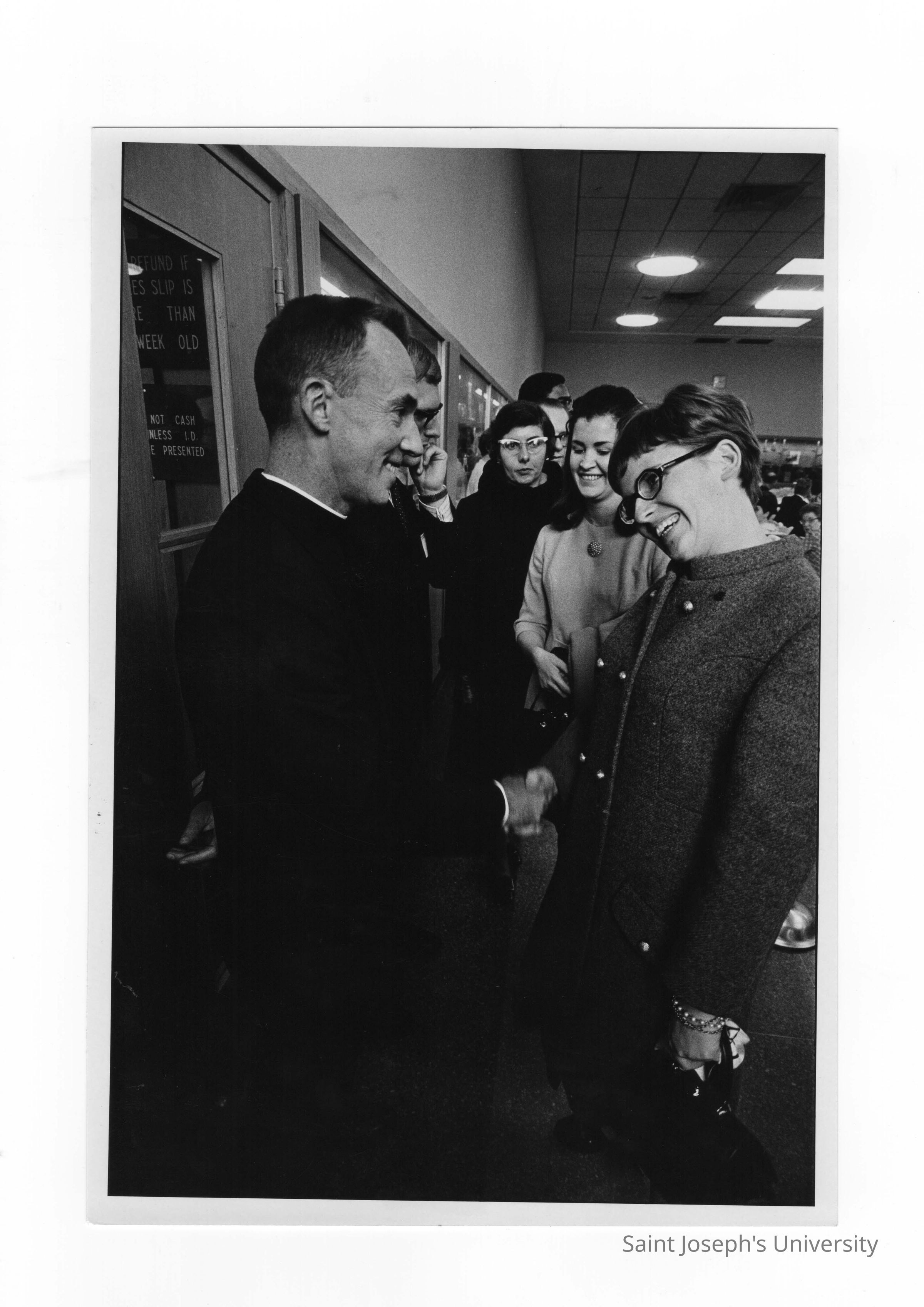 Inauguration of President Terrence Toland, S.J., November 14, 1968. Father Toland greets guests in a receiving line.