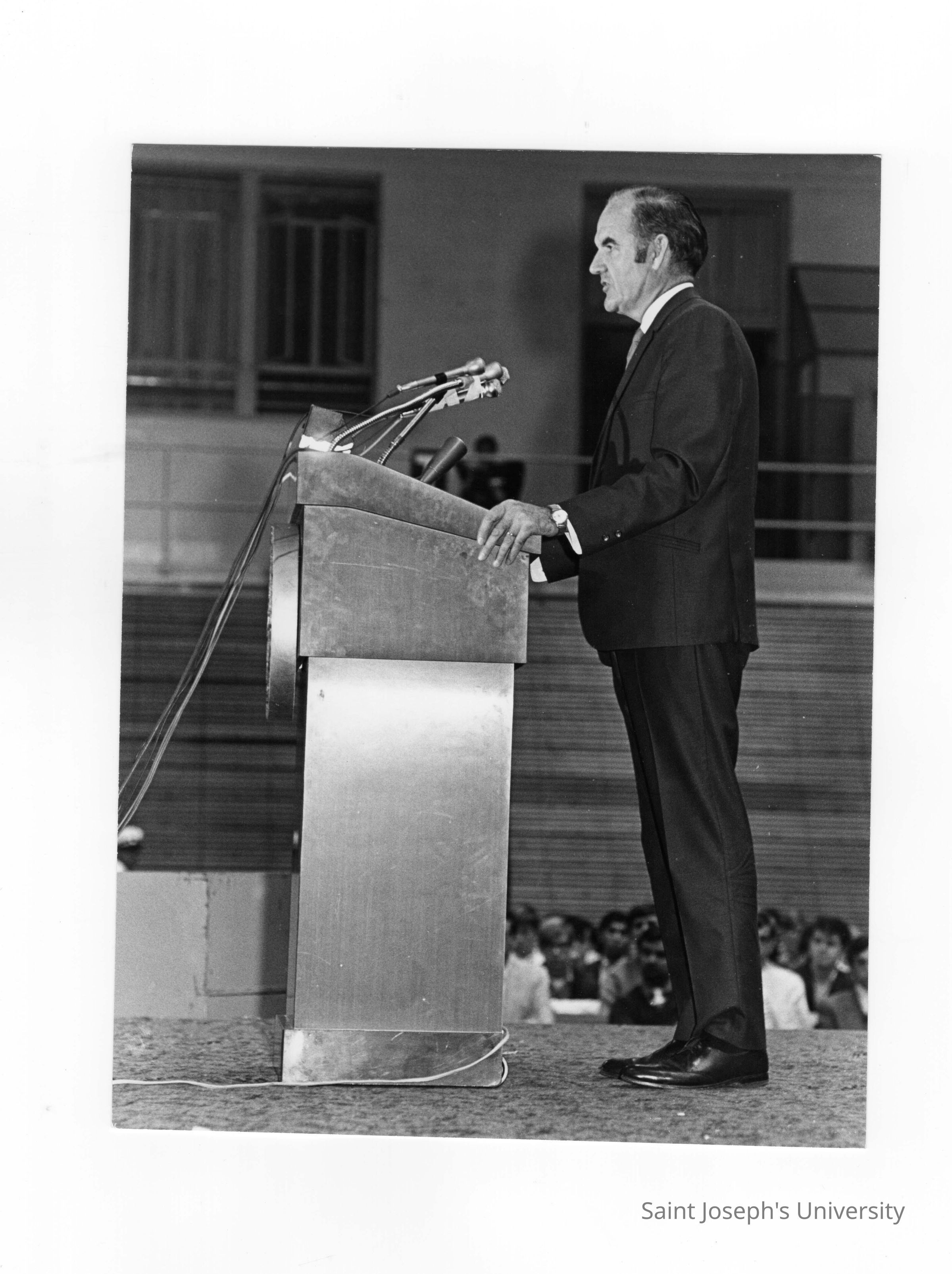 Senator George McGovern delivering speech from podium in Field House, October 2, 1969.