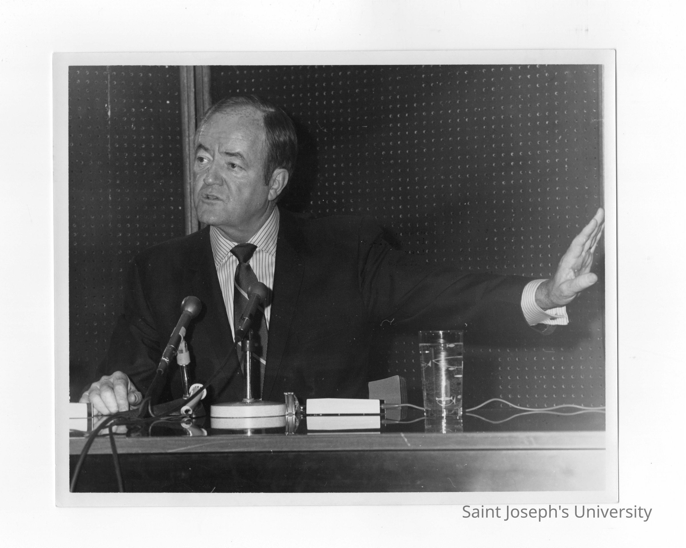 Vice President Hubert Humphrey seated at table speaking during his visit to SJC campus, January 27, 1970.