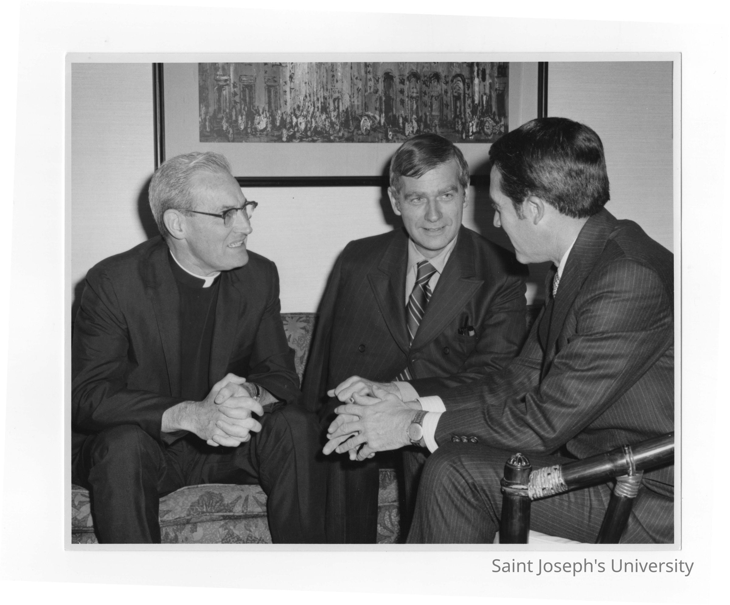 Senator Mark Hatfield speaking with Michael Smith, S.J., and another individual prior to delivering speech to SJC campus, October 4, 1970.