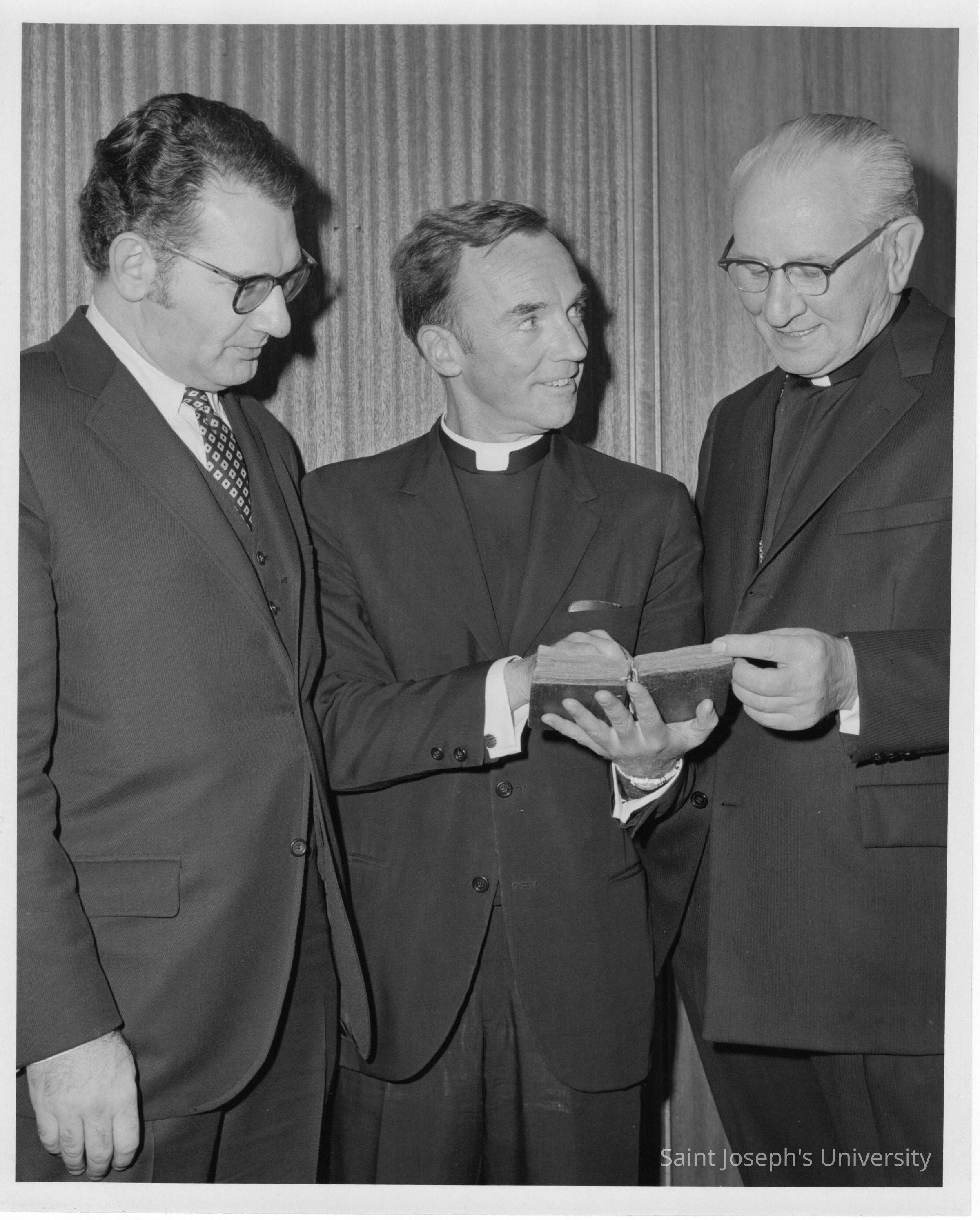Rabbi Marc Tanenbaum, Terrence Toland, S.J., and Cardinal John Krol examining ancient book during Third Institute on Catholic -Jewish Relations, March 2, 1971.