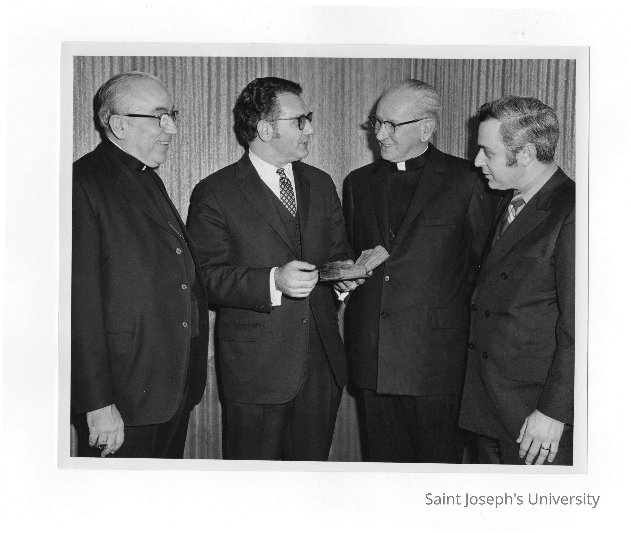 Rabbi Marc Tanenbaum, Cardinal John Krol, Bishop John Graham, and Edward H. Rosen (?) examining ancient book during Third Institute on Catholic -Jewish Relations, March 2, 1971.