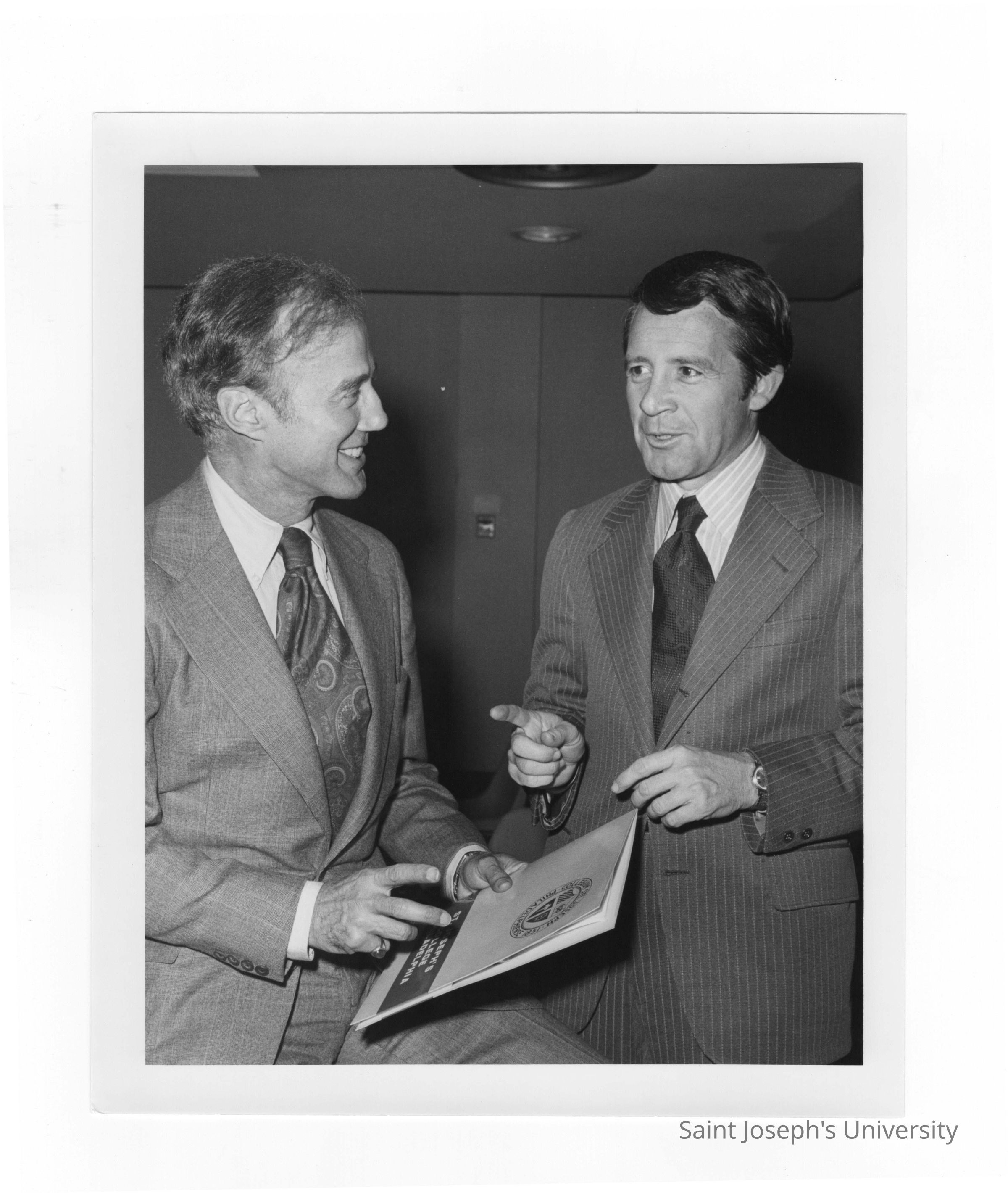 Norman Denny and John Bunting discussing agenda during Conference on Corporate Social Responsibility, March 6, 1974.