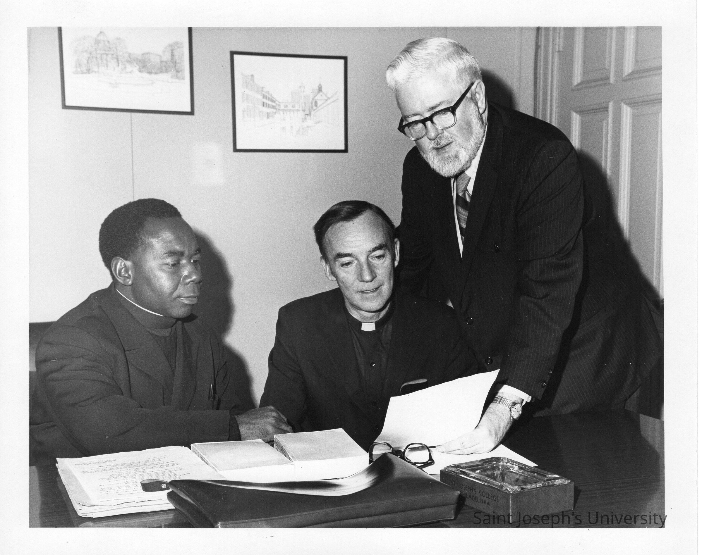 R. P. Mveng, S.J., Director of Cultural Affairs of Federal Republic of Cameroon,with Terrence Toland, S.J., and James E. Dougherty during visit to SJC campus as part of State Department tour, January 31, 1972.