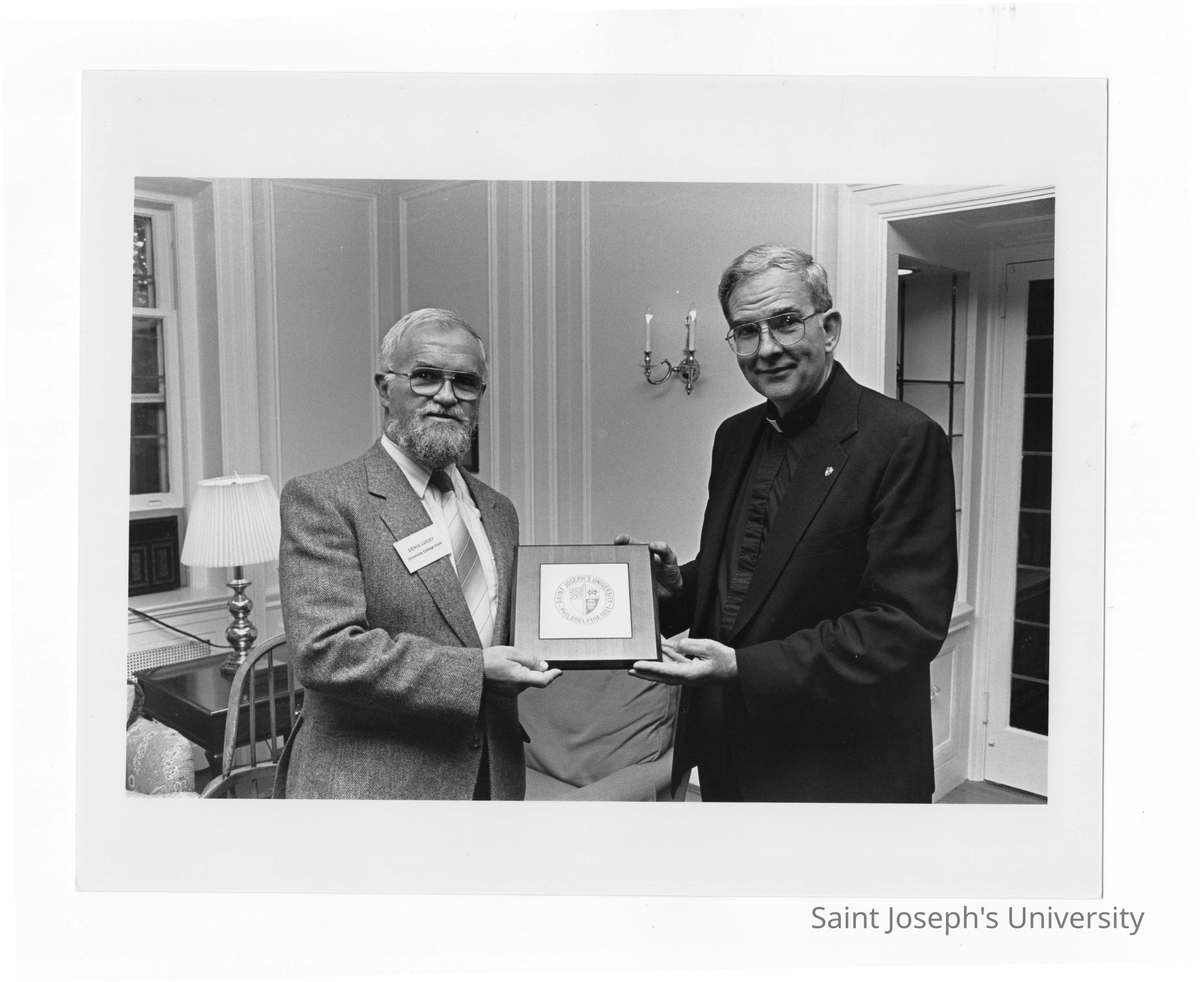 Nicholas S. Rashford, S.J., with Denis Lucey of Cork College in Ireland during his visit to SJU campus. President Rashford is presenting Lucey with a decorative Saint Joseph University plaque.