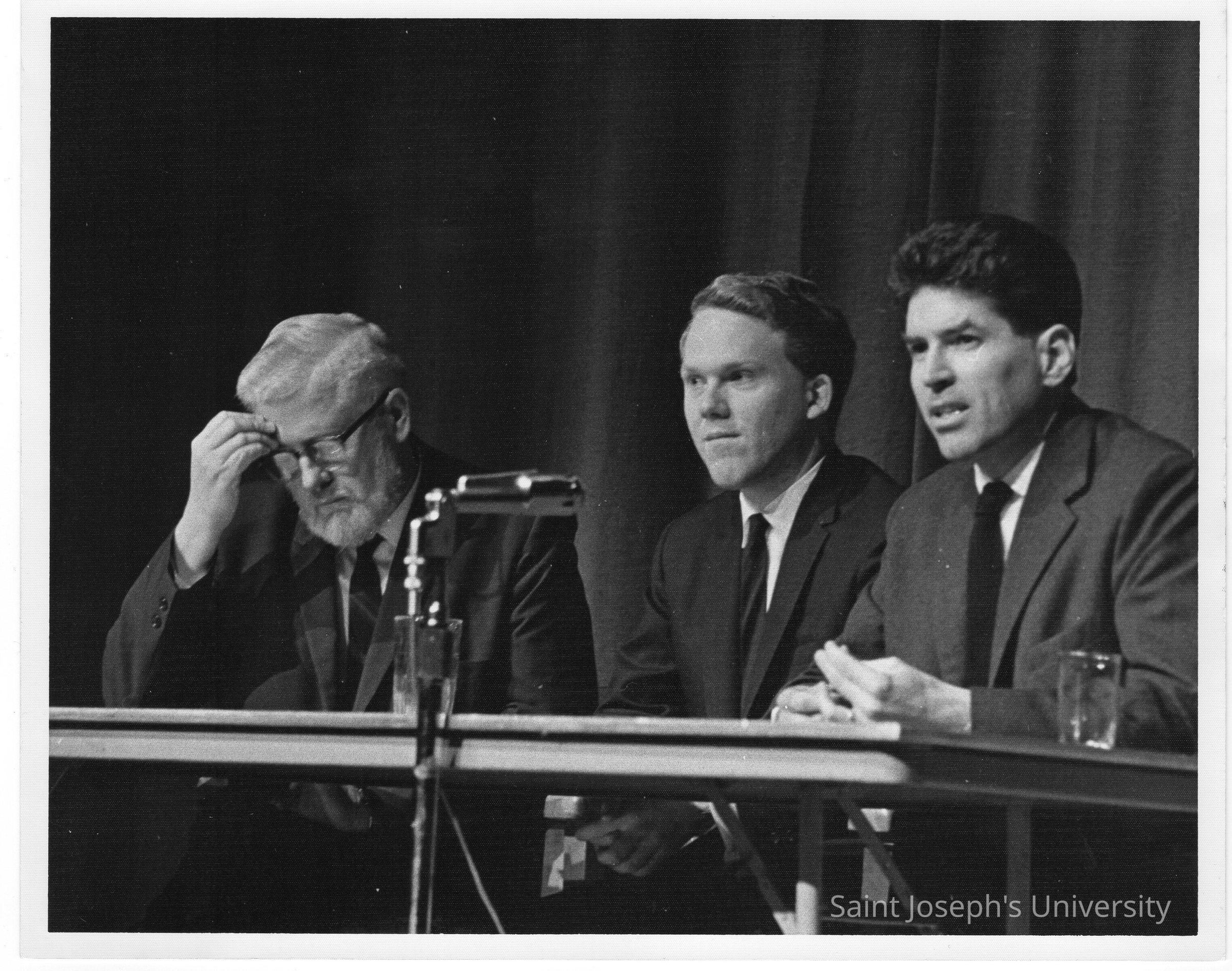 James E. Dougherty, David Marshall, and Fred J. Foley, Jr. participating on panel debating the Vietnam War before an audience of 400 students and faculty.