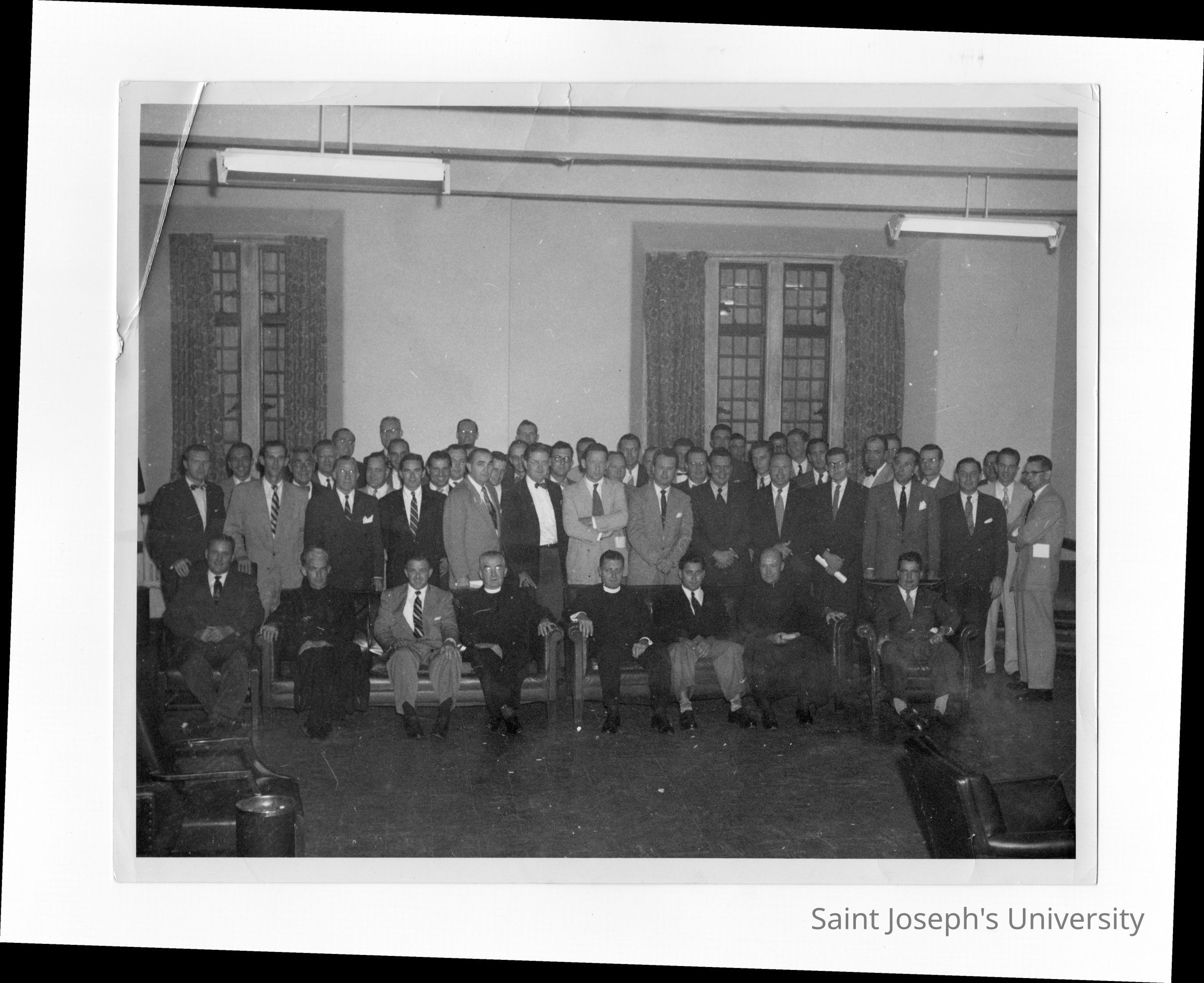 View of Saint Joseph's College Alumni Board of Governors and their guests after quarterly meeting, September 28, 1953. Includes Francis J. Emory, S.J., Edward G. Jacklin, S.J., Joseph Hogan, S.J., and Joseph F. McNamara, S.J., W. F. Ariano, and othersEntry/Object ID