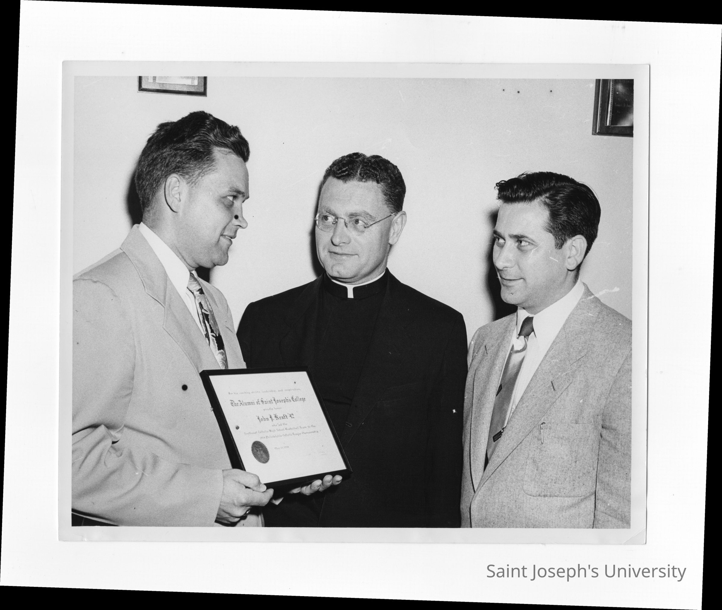 John J. Kraft holding alumni award certificate with Edward G. Jacklin, S.J., and William Ariano watching, c. 1953.