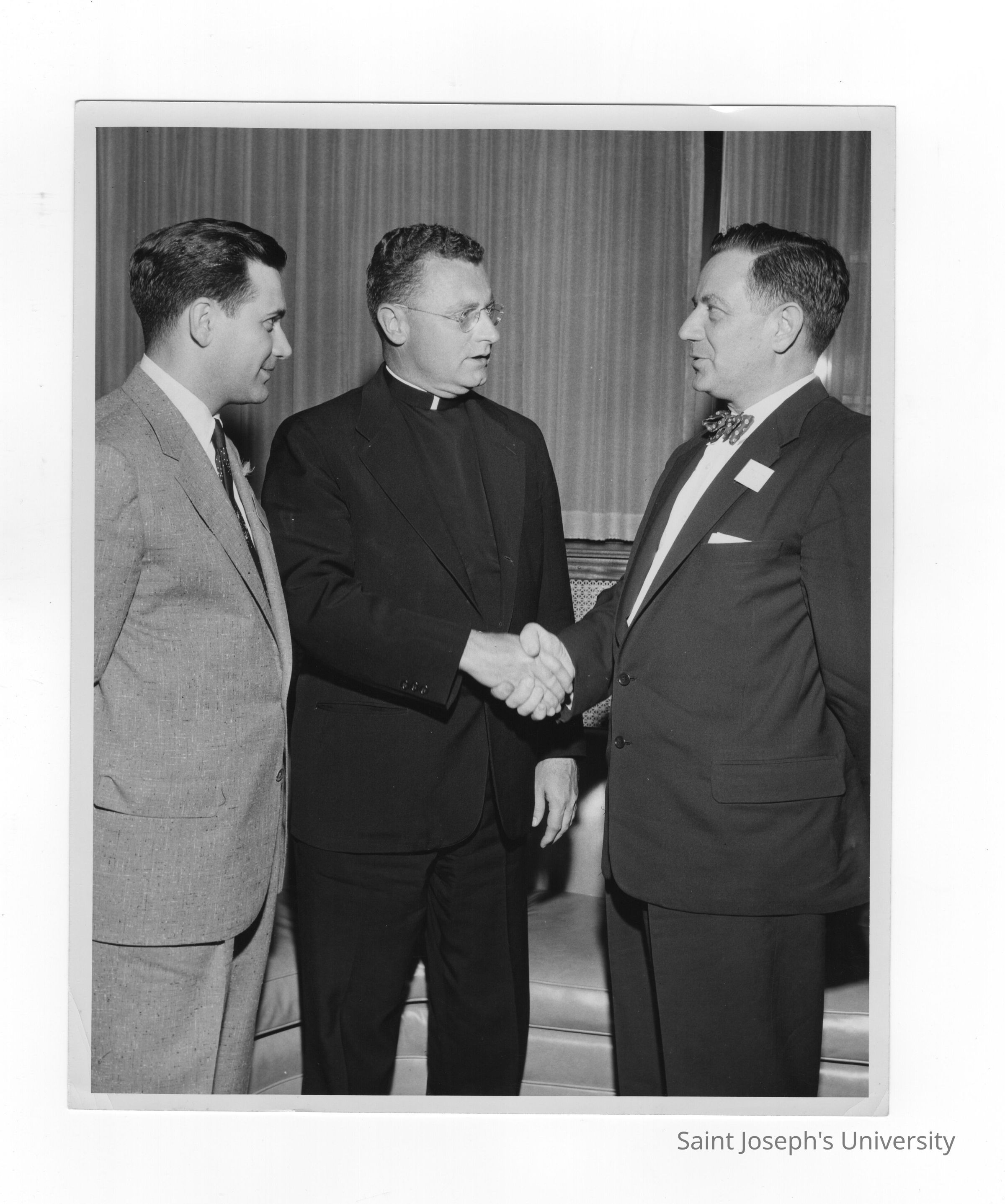 Edward G. Jacklin, S.J., and William Ariano congratulating newly elected alumni president, Francis Lammer, 1955.