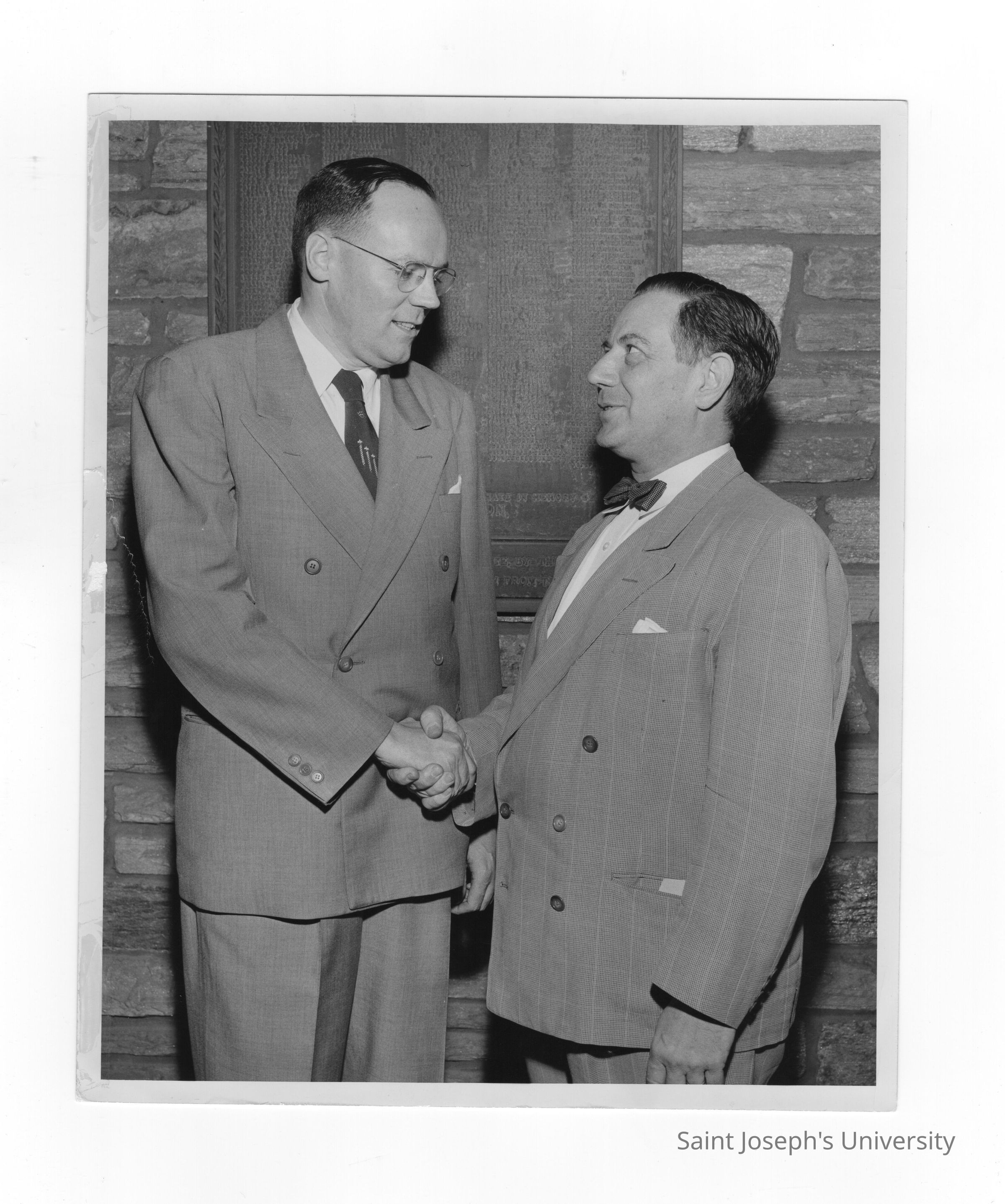Alumni association president, Francis Lammer, greeting Frank Lalley, chairman of the annual giving drive, June 2, 1955.