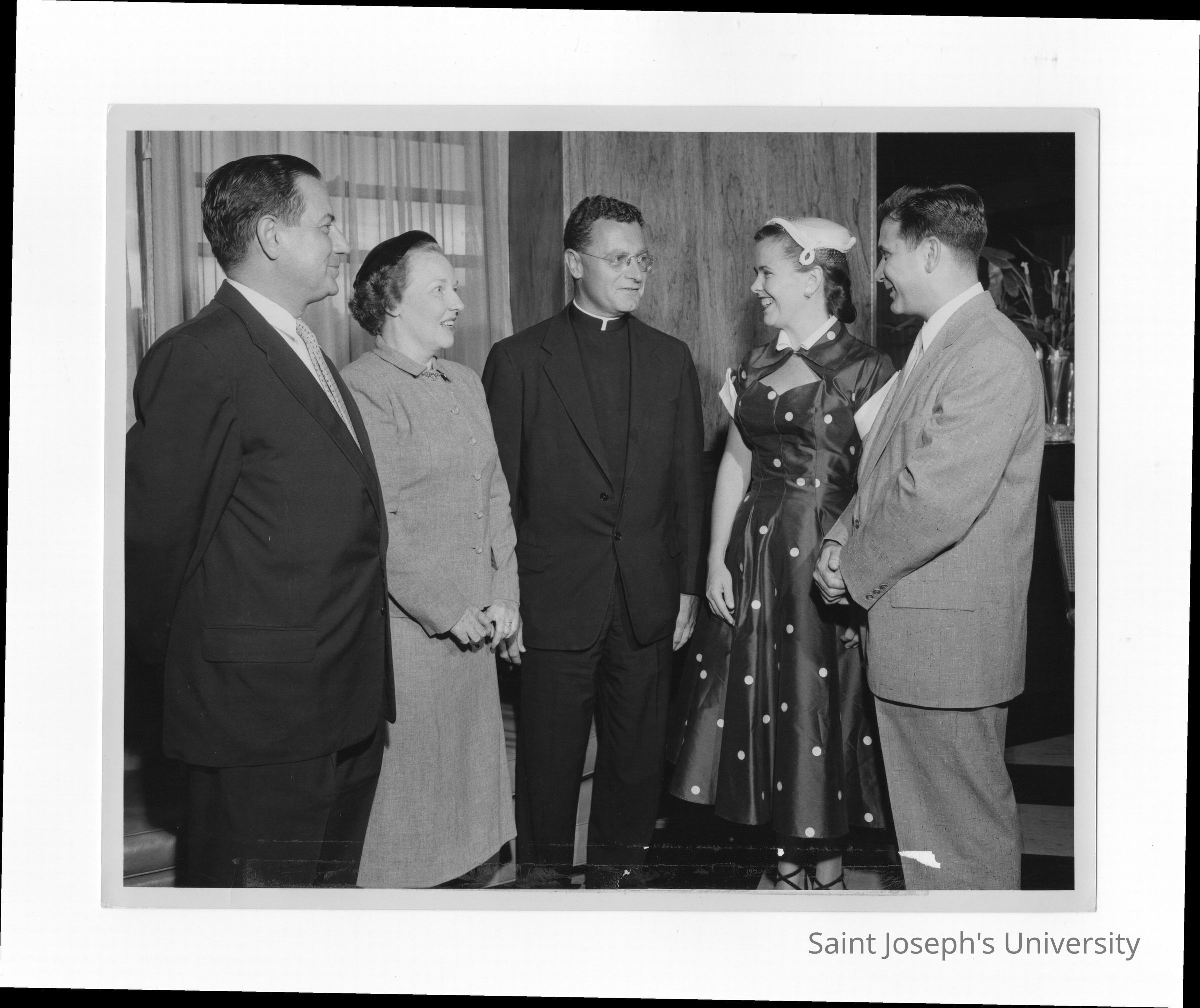 Edward G. Jacklin, S.J., with alumni officers and their wives, Mr. and Mrs. Francis Lammer, and Mr. and Mrs. William Ariano, at a reception, September 11, 1955.