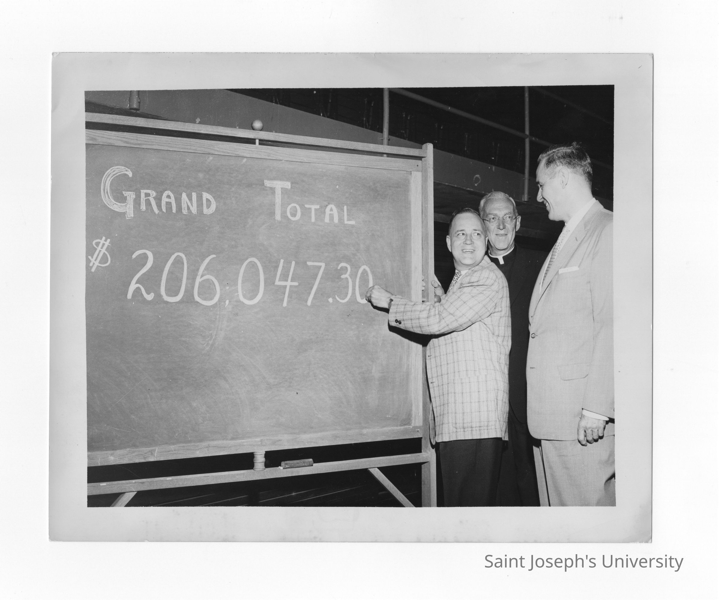 J. Joseph Bluett, S.J., and Robert Cranage and Ray Trainer of the alumni association check total funds raised on blackboard during fundraising drive, 1959.