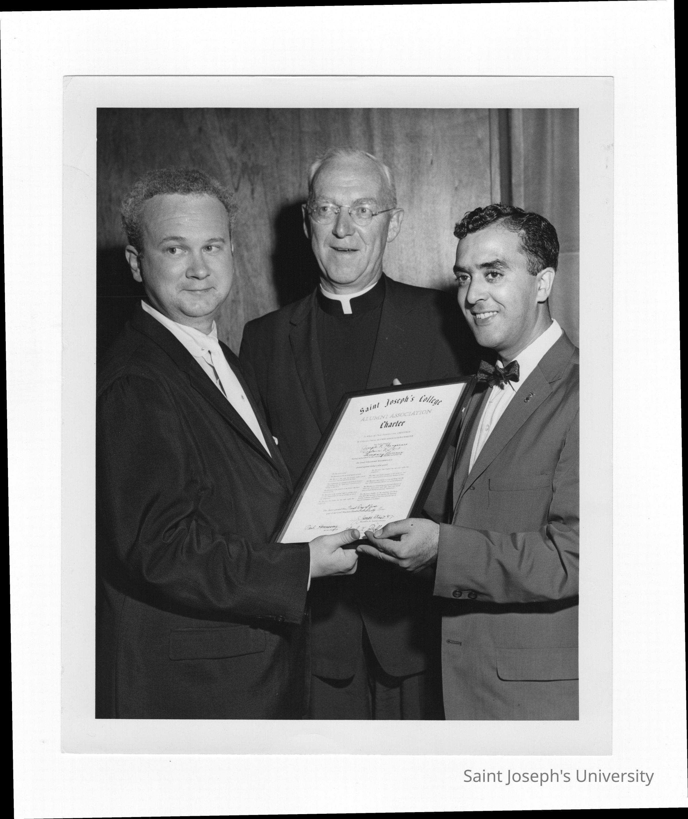 Air Force captain, Joseph Manganero, receiving alumni association Charter award from J. Joseph Bluett, S.J., and Frank X. Duff, June 1, 1961.
